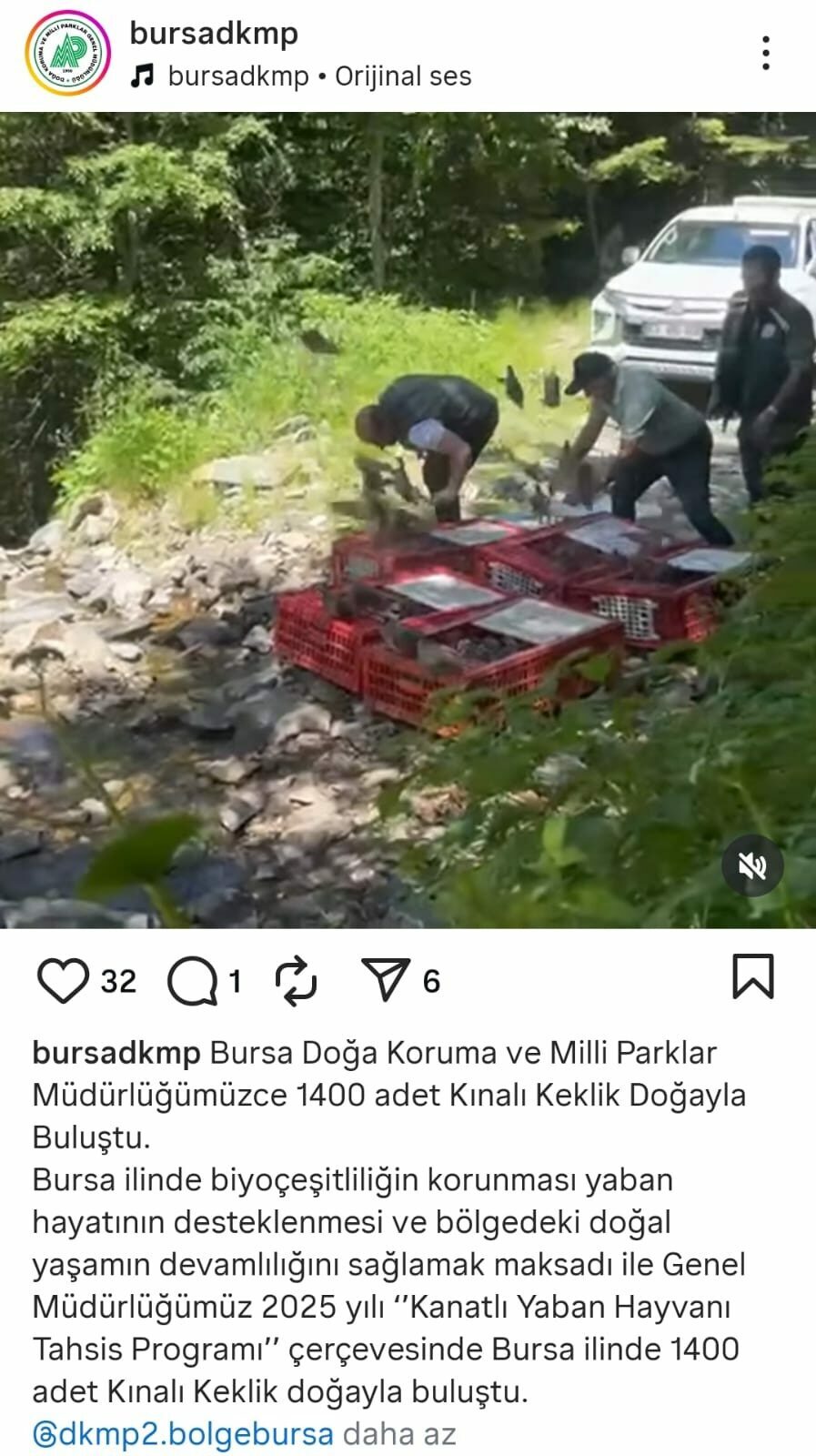 Bursa Doğa Koruma ve Milli Parklar Müdürlüğü’nün sosyal medya hesabından yapılan açıklamada, “Bursa ilinde biyoçeşitliliğin korunması yaban hayatının desteklenmesi ve bölgedeki doğal yaşamın devamlılığını sağlamak maksadı ile Genel Müdürlüğümüz 2025 yılı ‘’Kanatlı Yaban Hayvanı Tahsis Programı’’ çerçevesinde Bursa ilinde 1400 adet Kınalı Keklik doğayla buluştu” ifadelerine yer verildi.