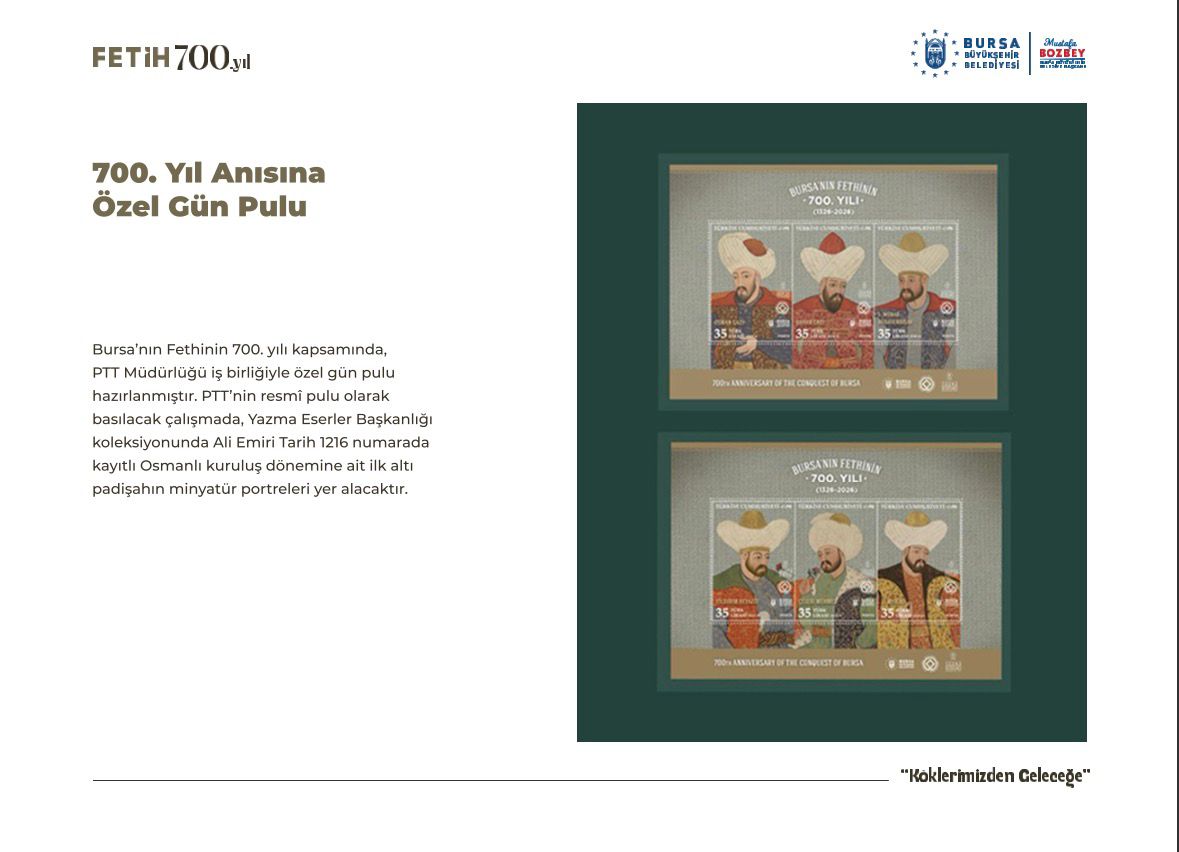 Sanal gerçeklik “Kutlu Rüya” gezici sergisi 17 ilçeyi dolaşacak. Pınarbaşı Parkı’nda fetih temalı İznik çinisi pano açılacak, 700. yıla özel PTT hatıra pulu basılacak. Kent genelinde 700 çınar fidanı dikilecek.