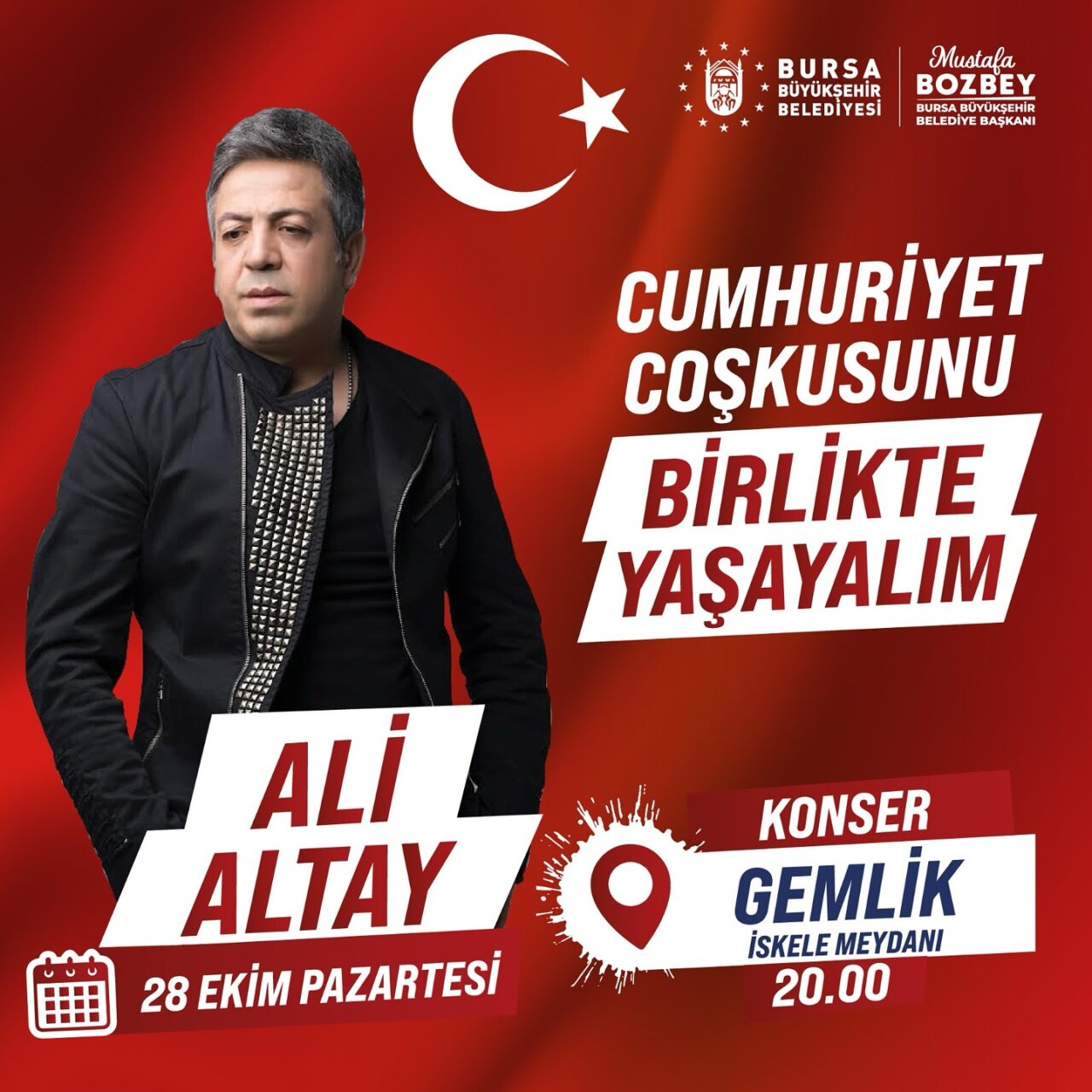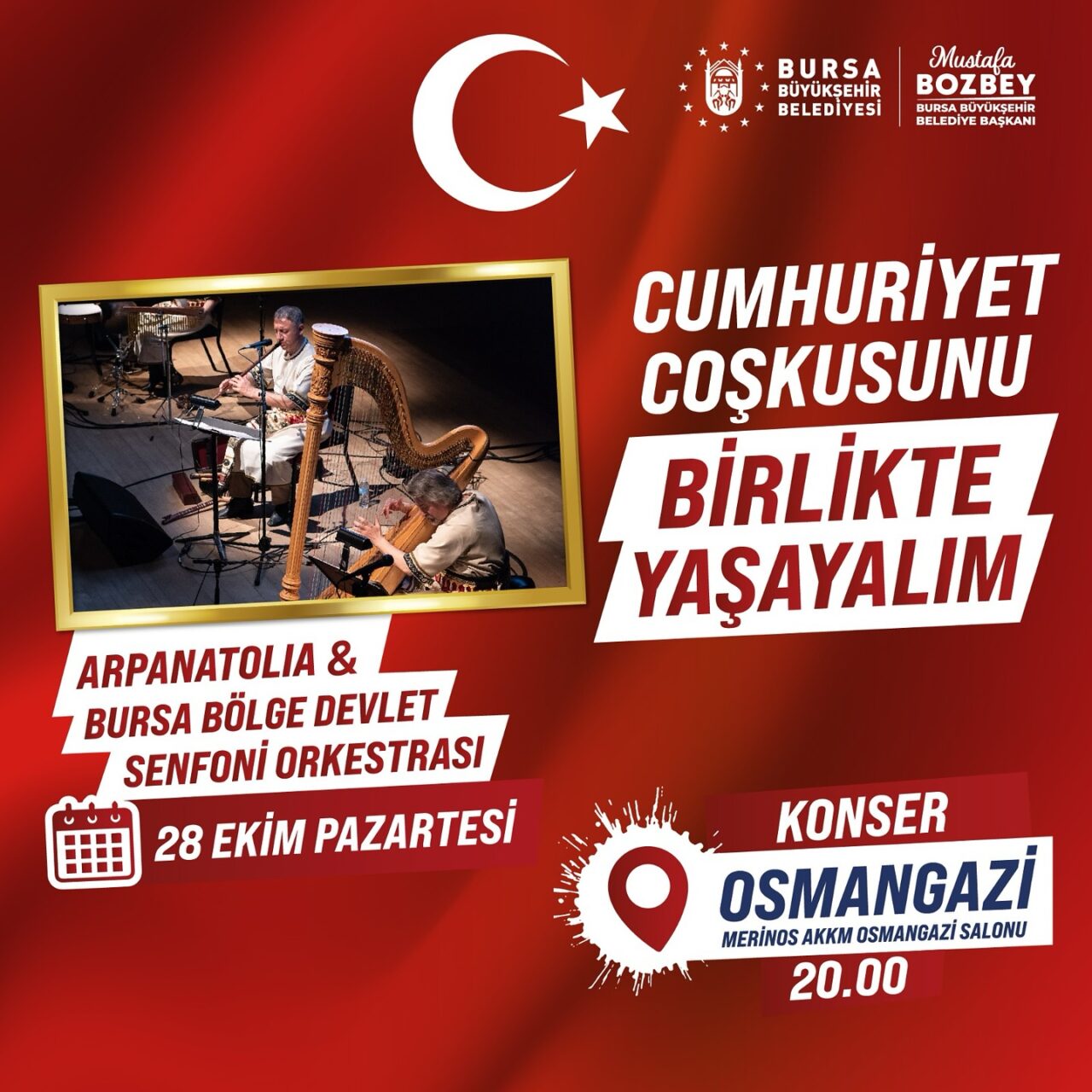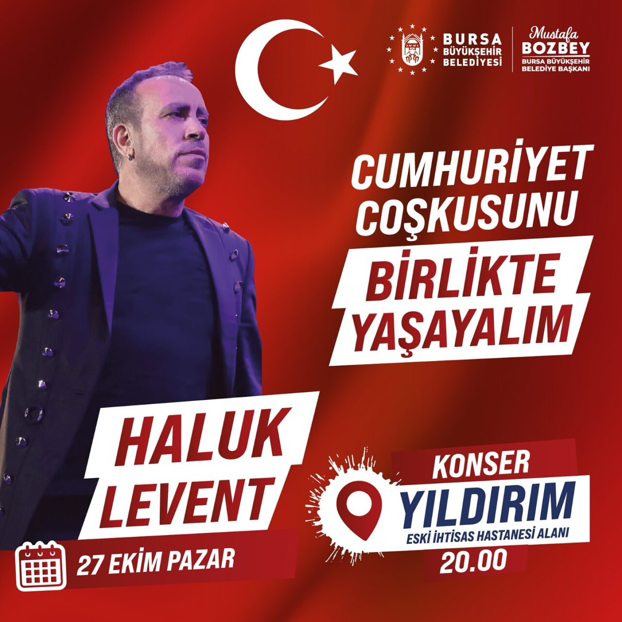 27 Ekim Pazar günü ise Yıldırım ilçesi eski İhtisas Hastane alanında ünlü sanatçı Haluk Levent rüzgarı esecek. 28 Ekim Pazartesi günü ise Merinos Atatürk Kongre Kültür Merkezi’nde Arpanatolıa-Bursa Bölge Devlet Senfoni Orkestrası konseri ile Gemlik ilçesi İskele Meydanı’nda Ali Altay konseri düzenlenecek.