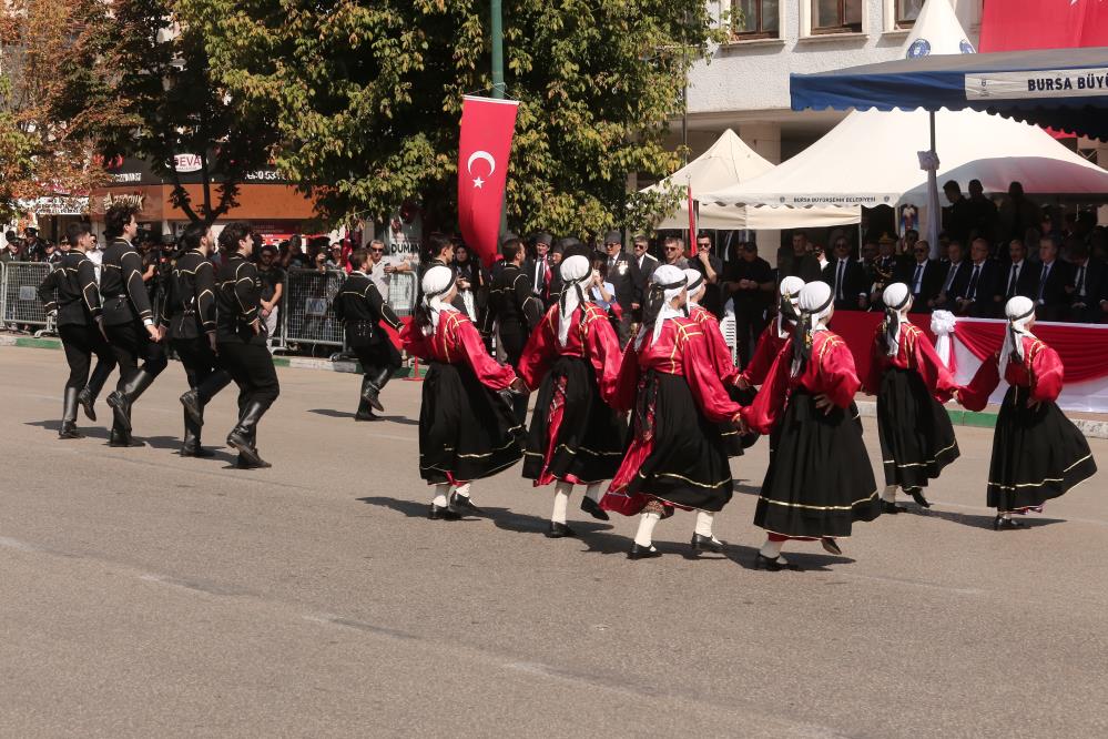 Kutlama programında çelenk sunulmasının ardından Vali Mahmut Demirtaş, vilayet binasında tebrikleri kabul etti. Ardından üstü açık araçla vatandaşların bayramını kutladı. Selamlama sonrası Osmangazi, Yıldırım, Nilüfer belediyeleri folklor ekipleri gösterilerini sundu. Günün anlam ve önemini anlatan konuşmayı Veteriner Binbaşı Mustafa Sönmez yaptı. Bursa Mehter Takımı ve Tahtakıran Kılıç-Kalkan ekibinin gösterileri sonrası program resmi geçitle devam etti.