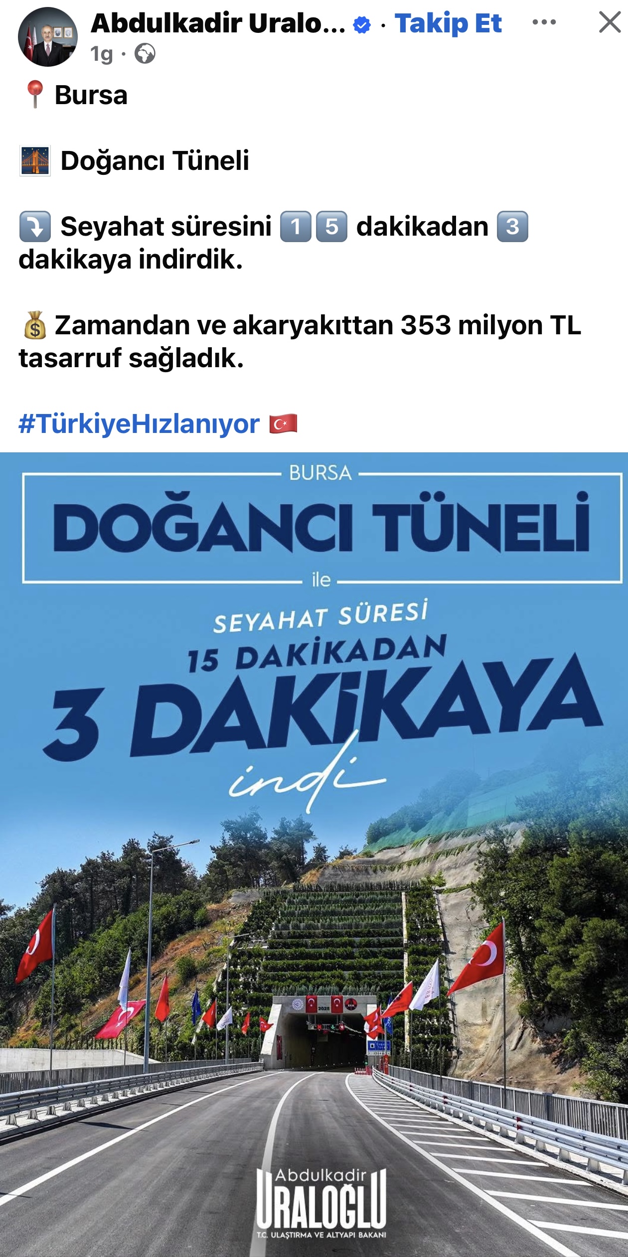 Ulaştırma ve Altyapı Bakanı Abdulkadir Uraloğlu da dün kendisinin ve bakanlığının sosyal medya hesaplarından Bursa’daki, Orhaneli, Büyükorhan ve Harmancık ilçeleriyle Kütahya, Balıkesir gibi civar illerin ilçeleriyle Bursa’ya bağlantısını 15 dakikadan 3 dakikaya indiren etaptaki o tüneli paylaştı.
