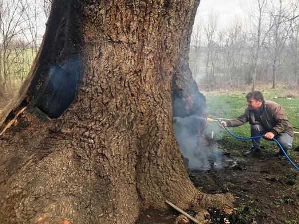 Dün akşam saatlerinde alevleri söndürülen çınar ağacının, bu kez sabah saatlerinde iç kısmından dumanlar çıkmaya başladı. Bunun üzerine bölge halkı, traktörlerin arkasına bağladıkları su pompalarıyla müdahale ederek, küçük çaplı alevleri söndürdü.