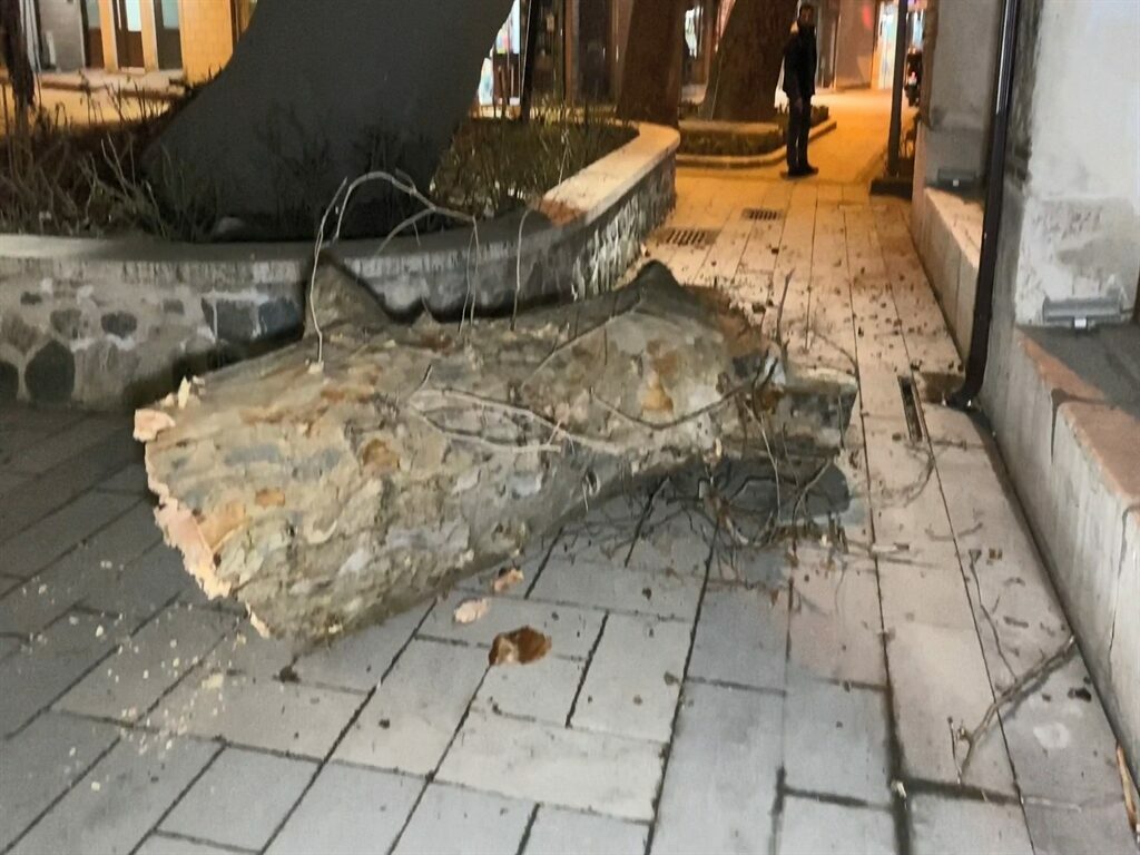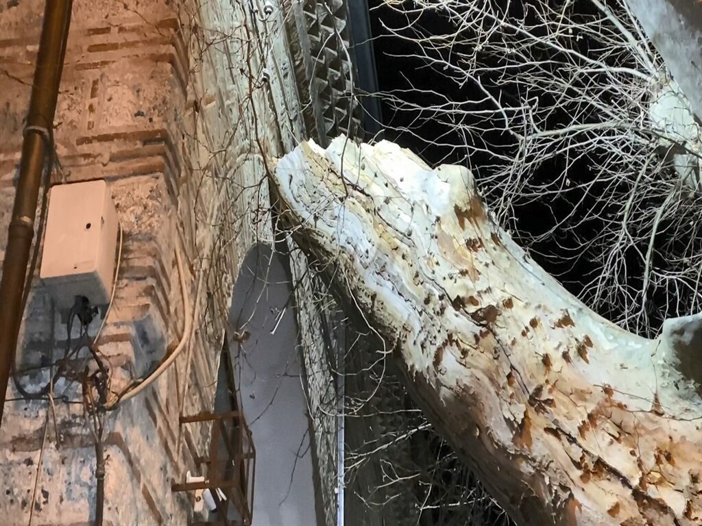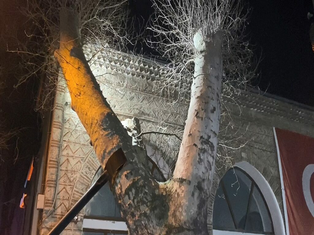 Ağaç caminin duvarına dayanırken, çevredekilerin ihbarıyla adrese polis ve itfaiye ekipleri sevk edildi. Ekipler, ağacın parçalanarak kaldırılması için çalışma başlattı.