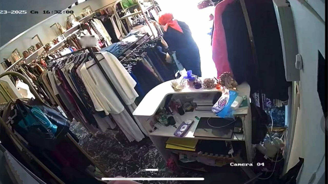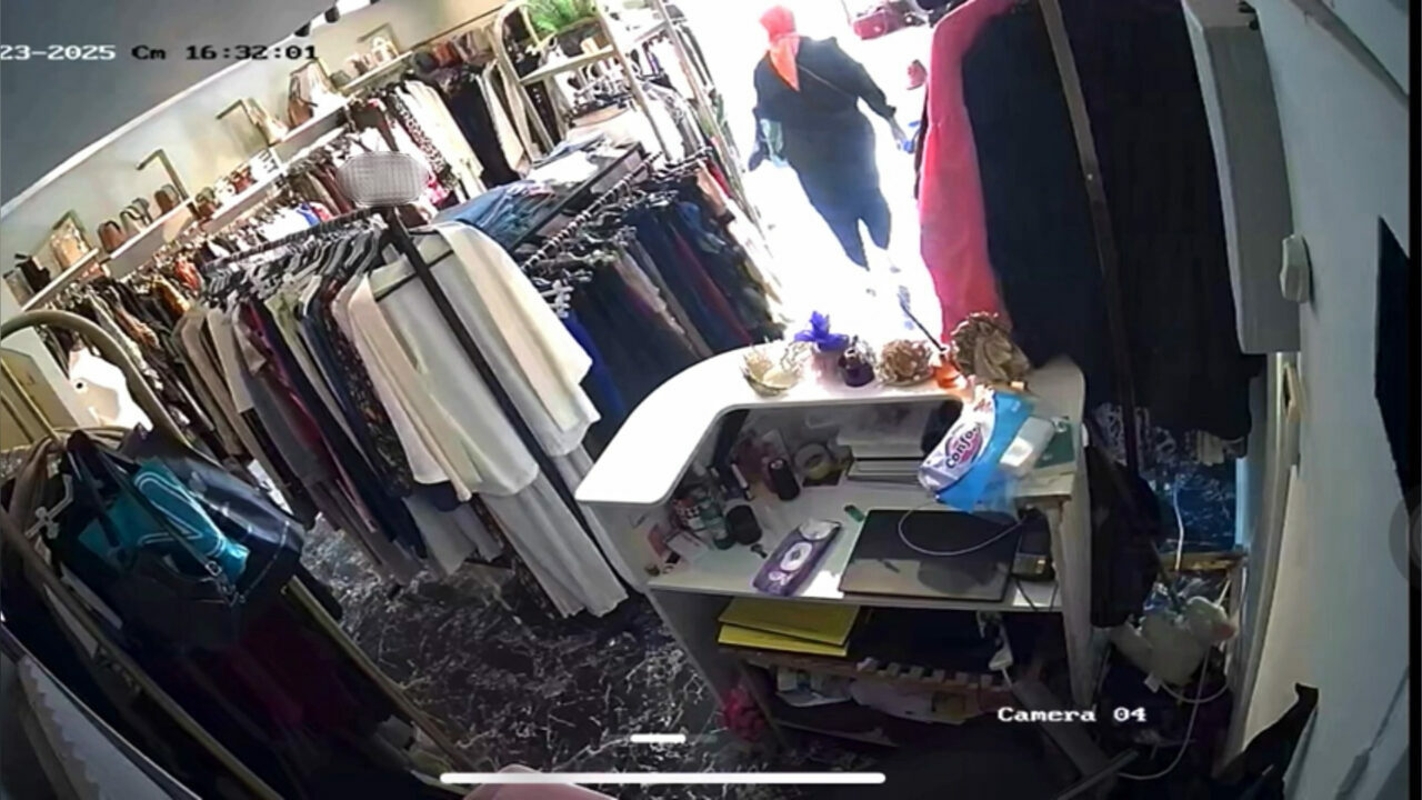 Giyim mağazasına girerek askıdaki kıyafetleri inceleyen kadın, ardından bir gömleği elindeki poşete koyup hızla iş yerinden çıkarak uzaklaştı.