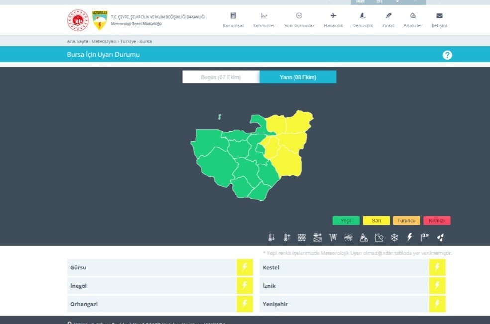 Öte yandan, Bursa’nın 6 ilçesi, haritada sarı ile işaretlendi. Sarı renk, ‘Hava durumu potansiyel tehlikelidir. Tahmin edilen meteorolojik hadise olağandışı olmamakla birlikte meteorolojik şartlardan etkilenebilecek faaliyetler konusunda dikkatli olunmalıdır’ uyarılarını kapsıyor.