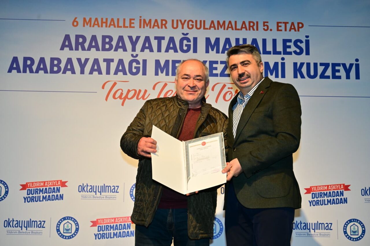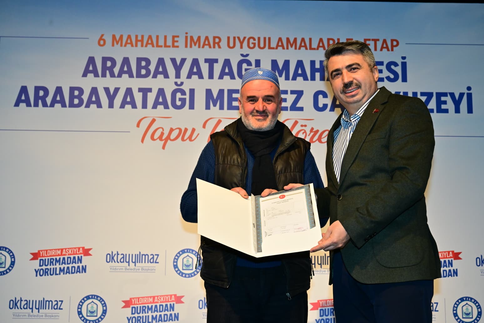 Arabayatağı, Çınarönü, Ulus, Yavuzselim, Mevlâna ve Hacivat mahallelerini kapsayan 300 hektarlık alanda yürütülen tapu ve imar uygulamalarının Yıldırım’ın geleceğini şekillendireceğini vurgulayan Yıldırım Belediye Başkanı Oktay Yılmaz, “Bu mahallelerimizde 5 etap halinde gerçekleştirdiğimiz çalışmalar neticesinde 7 bin 417 tapuyu hak sahiplerine teslim ettik. 3. Etaptaki 18 bin 950 tapu için çalışmalarımız tamamlanma aşamasına geldi. Kısa süre içerisinde bu tapuları da hak sahiplerine teslim edeceğiz” dedi.
