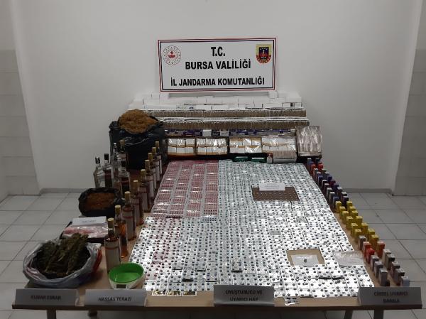 Teknik ve fiziki takibin ardından ekipler H.Ö.’nün evine dün baskın yaptı. Evde yapılan aramada, 500 gram kubar esrar, 4 bin 387 uyuşturucu ve uyarıcı hap, 50 captagon uyuşturucu hap, 81 bin 740 tütün doldurulmuş makaron, 10 kilogram kıyılmış tütün, 12 litre kaçak içki ve 1 hassas terazi ele geçirildi.