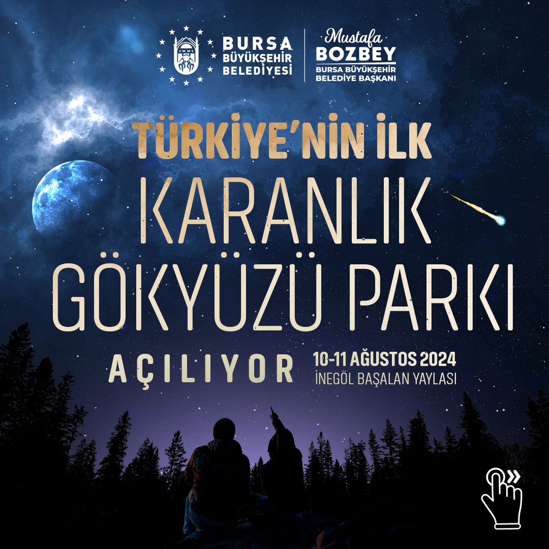 Daha yaşanabilir ve temiz bir kent için çalışmalarını sürdüren Bursa Büyükşehir Belediyesi, Uluslararası Karanlık Gökyüzü Birliği’nin belirlediği standartlara uygun olarak Türkiye’nin ilk ‘Karanlık Gökyüzü Parkı’nı Bursa’ya kazandırıyor. Dünyada sadece 92 örneği bulunan Karanlık Gökyüzü Parkı projesi, ışık kirliliğinden en az etkilenen İnegöl ilçesi Başalan Yaylası’nda 10-11 Ağustos Cumartesi ve Pazar günleri hayata geçirilecek. Başalan Yaylası’nın doğal dokusu korunarak hazırlanan park, turizmin çeşitlendirilmesi ve macera turizmine yönelik çalışmalar için tematik bir alan olacak. Doğa ve astronomi meraklıları iki gün boyunca astronomi, doğa gözlemleri ve çeşitli atölyelerle dolu dolu bir deneyim yaşamı fırsatı bulacak. Gün boyunca teleskop yapım aşamaları ve astro fotoğrafçılık gibi çeşitli atölyeler, drama ve oyun etkinlikleri, vaka çalışmaları, karaoke ve müzik dinletisi, astronomi üzerine sohbetler yapılacak. Gece saatlerinde ise katılımcılar perseid göktaşı yağmurunu gözlemleyebilecek. Etkinlikler kapsamında fikir yarışması da düzenlenerek katılımcılar çeşitli ödüller kazanma fırsatı bulacak.