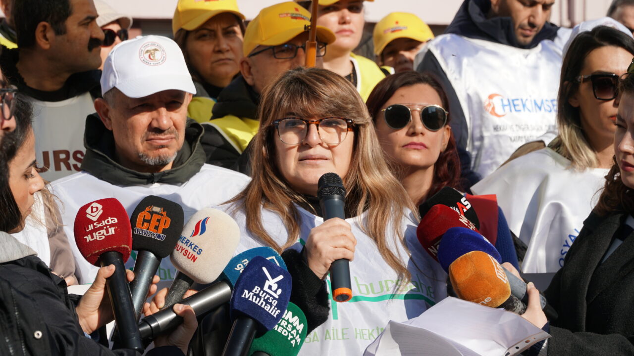 Bursa Aile Hekimleri Derneği Genel Sekreteri Dr. Zeynep Özsevimli ve sağlık çalışanları, Aile Hekimliği Ödeme ve Sözleşme Yönetmeliği’ne karşı üçüncü kez iş bırakarak İl Sağlık Müdürlüğü önünde toplandı. Sağlık çalışanlarının sorunlarını dile getiren Özsevimli, “Sağlık sistemini bir sorunlar yumağı haline getirdiniz. Meslek onurumuzu ve halk sağlığını savunmak için buradayız” diyerek, Sağlık Bakanlığı’na seslendi.