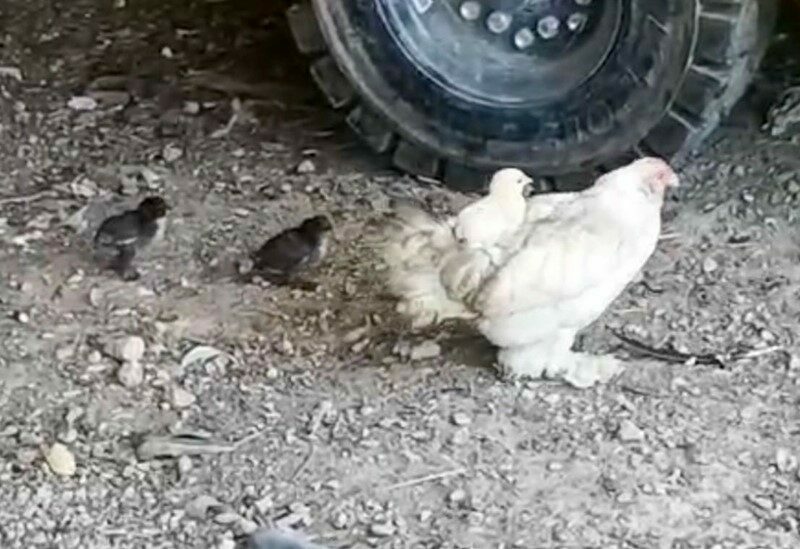 Hobi olarak stres atmak amacıyla süs tavukları besleyen bir tamircinin dükkanındaki kanatlılardan birinin civcivleri oldu. Tamirhane içinde gezinen tavuğun siyah olan 2 yavrusu yanında dolaşırken, beyaz olanı sırtına çıktı.