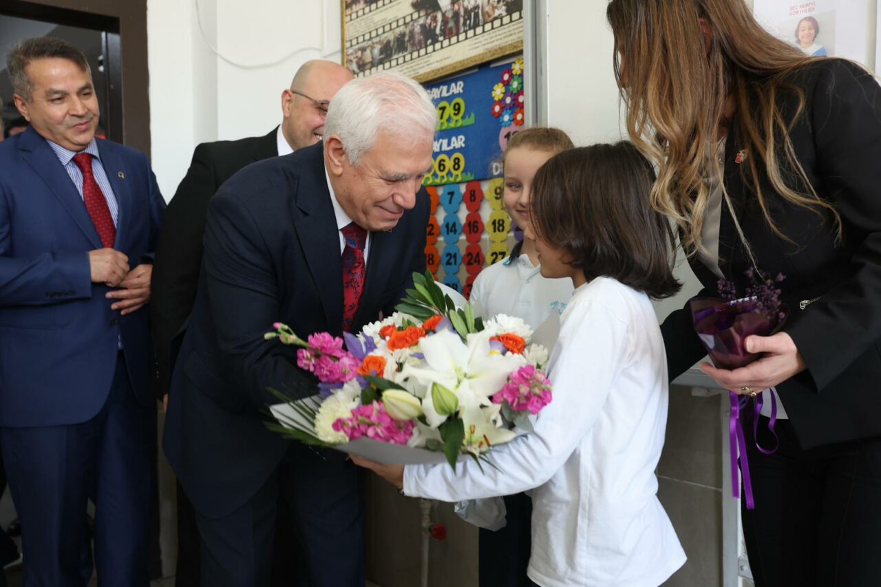 Buluşma öğrenciler için unutulmaz bir anıya dönüşürken, Başkan Mustafa Bozbey, kadın öğretmenlere de Dünya Kadınlar Günü dolayısıyla çiçek hediye etti.
