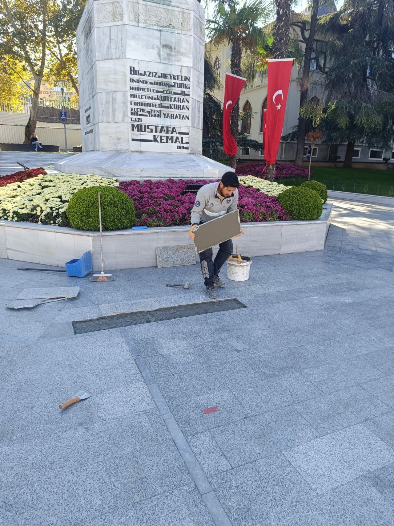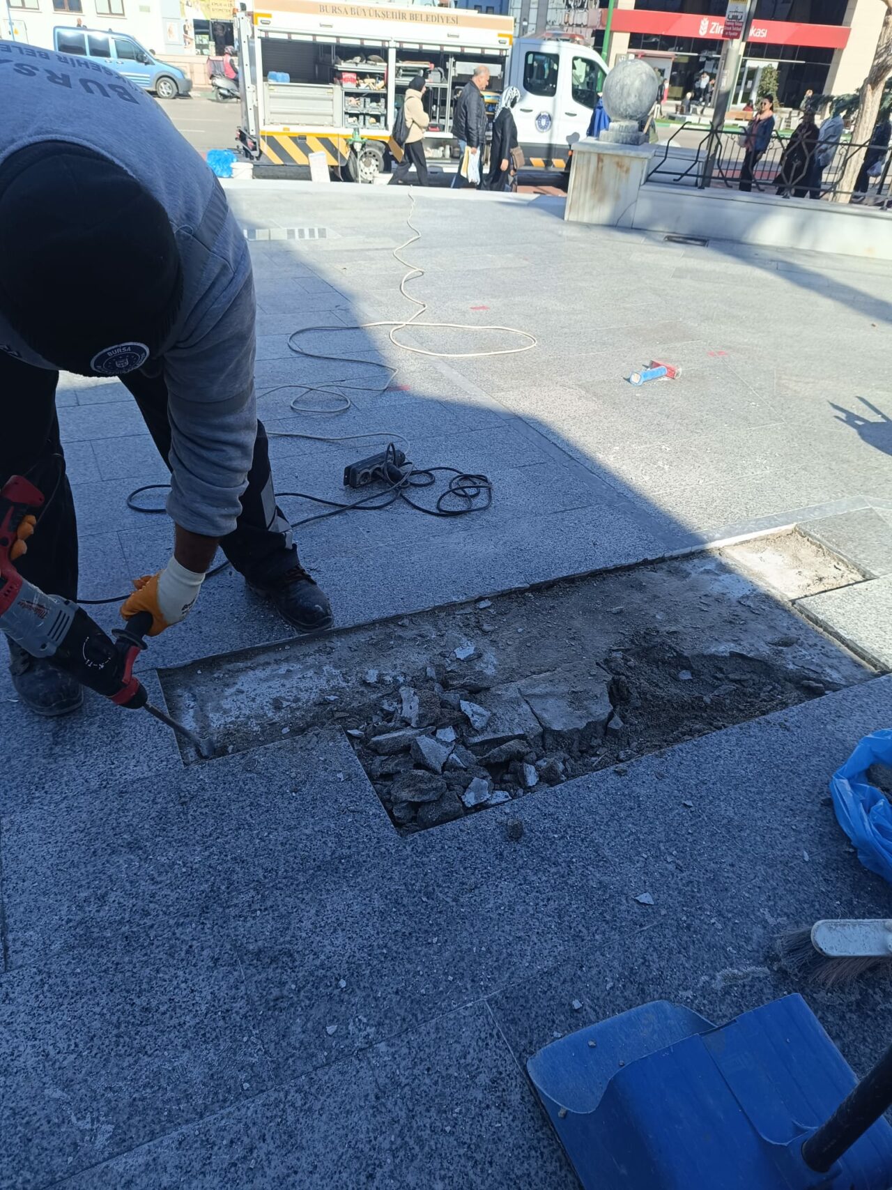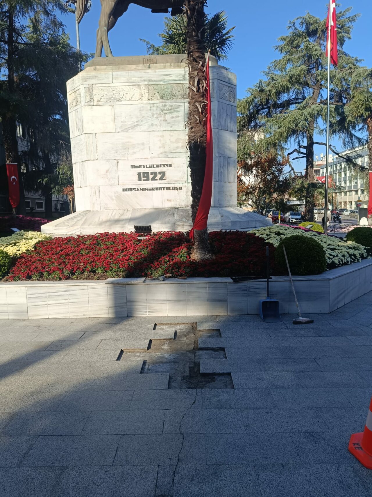 Büyükşehir Belediyesi Park ve Bahçeler Dairesi Başkanlığı Kent Estetiği Şube Müdürlüğü ekipleri, Bursa’nın merkezinde bulunan Atatürk Heykeli’nin etrafında kırılan mermerleri tek tek sökerek değiştirdi.