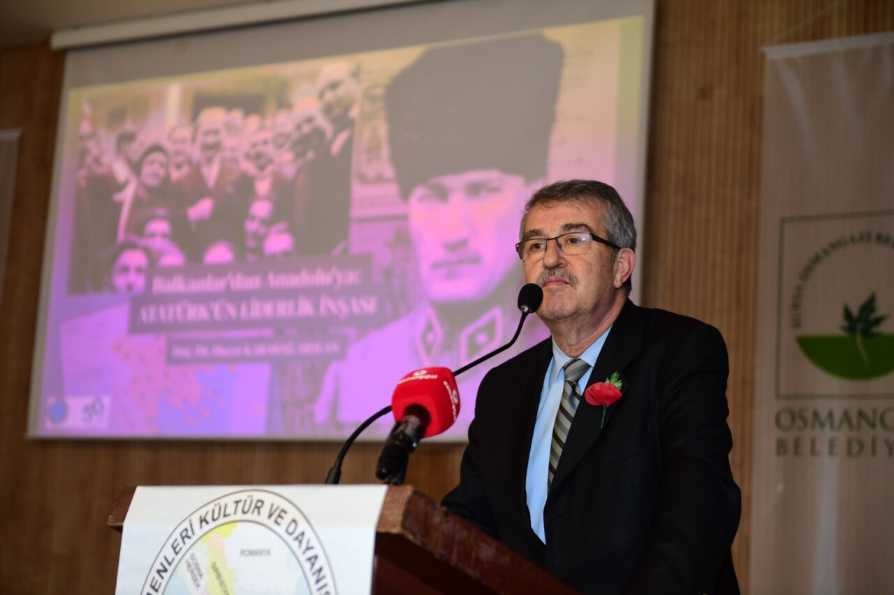 Doç. Dr. Hacer Karabağ Arslan ise, “Öncelikle Osmangazi Belediyemize ve BAL-GÖÇ’e çok teşekkür ediyorum. İlber Ortaylı, ‘Atatürk’ adlı eserinde şöyle başlar söze ‘Genellikle sanatkarlara, filozoflara ifade edilen büyük bir sevgi vardır, büyük bir muhabbet vardır, yıllar geçse de gittikçe artan, siyasilere ve devlet adamlarına, askerlere pek de böyle bir muhabbetten, sevgiden, özlemden bahsedemeyiz ama biz, her geçen yıl daha büyük bir muhabbet ve özlemle Atatürk’ü anmaktayız. Her yıl 10 Kasım’da da bunun, katlanarak arttığını görüyoruz.” diye konuştu.