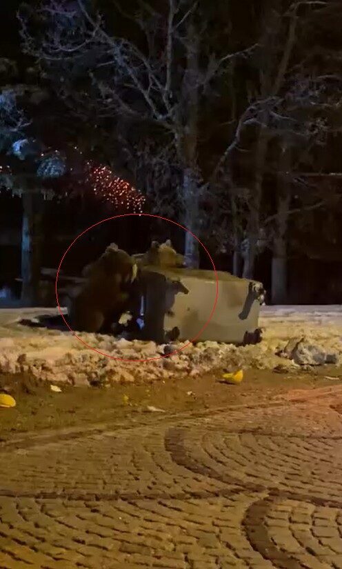 Uludağ yoluna çıkan vatandaşlar, yol kenarındaki çöp konteynerinin yanında yiyecek arayan ayıları görünce, o anları görüntülemek için otomobillerinden indi.
