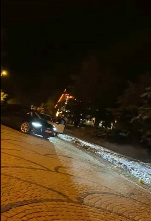 Bir vatandaş, ayıları cep telefonu kamerasıyla görüntülerken; otomobillerini yol ortasında durduran bir grup, yol kenarından topladıkları karları ayılara attı.