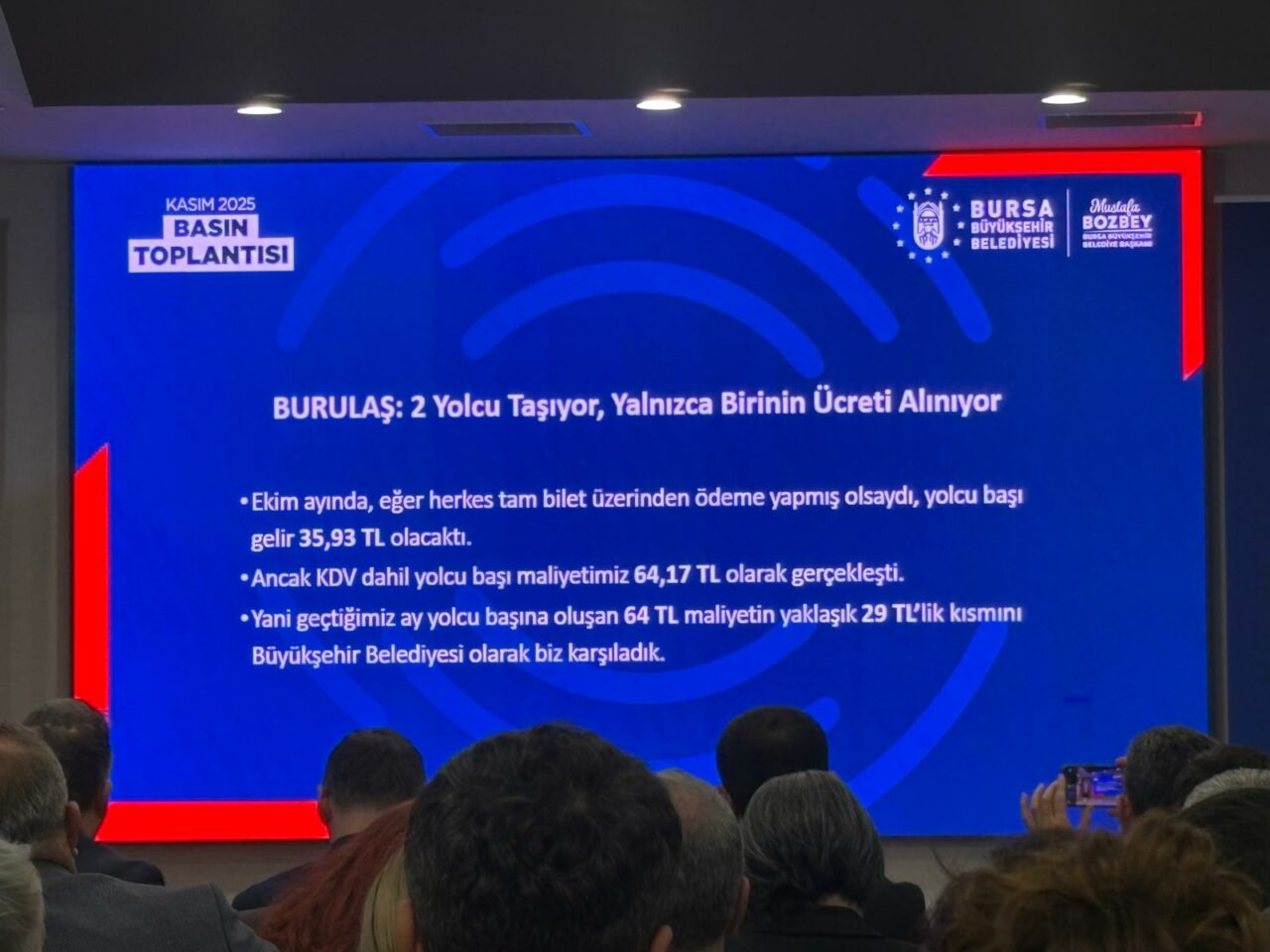 Ulaşım konusunda da rakamları paylaşan Büyükşehir Belediye Başkanı Bozbey, toplu taşıma maliyetinin belediye bütçesine büyük yük oluşturduğunu söyleyerek, “BURULAŞ’ta bir yolcunun maliyeti 64,17 lira. Bunun 29 lirasını biz sübvanse ediyoruz” dedi. Mustafa Bozbey, halk otobüslerine ödenen öğrenci taşımacılığı desteğine de dikkat çekerek, “Öğrencilerden alınan ücret ne olursa olsun, halk otobüslerine tam ücret ödüyoruz. Bu yıl sadece öğrenci ve ücretsiz yolcular için 3.6 milyar lira ödeme yaptık. Ücretsiz binen tüm yolcuların parasını tam ücret üzerinden belediye olarak biz karşılıyoruz” diye konuştuk.