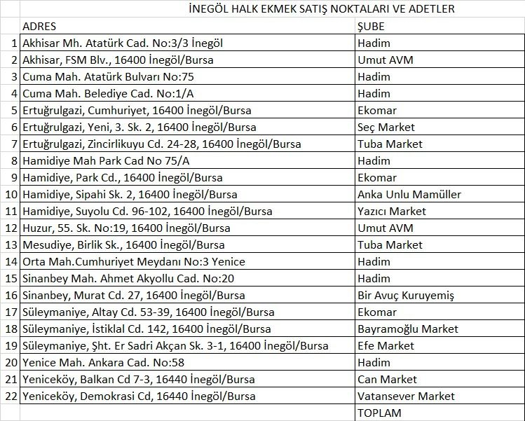 Başlangıç için günlük 2 bin adet üretim kapasitesiyle halk ekmek üretiminin startının verildiğini dile getiren Başkan Taban, “İnegöl Belediyesi halk ekmeği farklı mahallelerimizde 22 ayrı noktada satışa sunuldu. İnegöl Yerel Esnaf Platformu (İYEP) üyesi işyerlerimiz ekmek satış noktası oldu. Ancak zamanla hem ekmek üretimimiz artacak ve çeşitlenecek hem de satış noktalarımız talebe göre artacak. Şu an 11 ayrı mahallemizde 22 satış noktası bulunuyor” açıklamalarında bulundu.