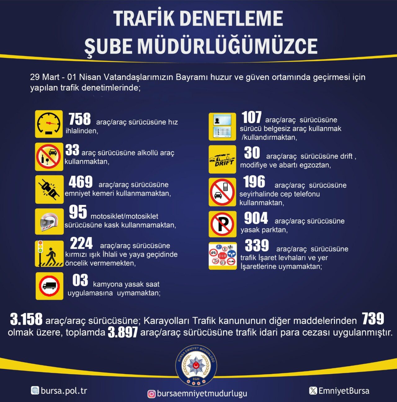 Bursalıların bayramı huzur ve güven ortamı içerisinde geçirmesi amacıyla 29 Mart – 1 Nisan tarihleri arasında il genelinde yapılan denetimlerde 3 bin 897 araç/araç sürücüsüne idari para cezası uygulandı.