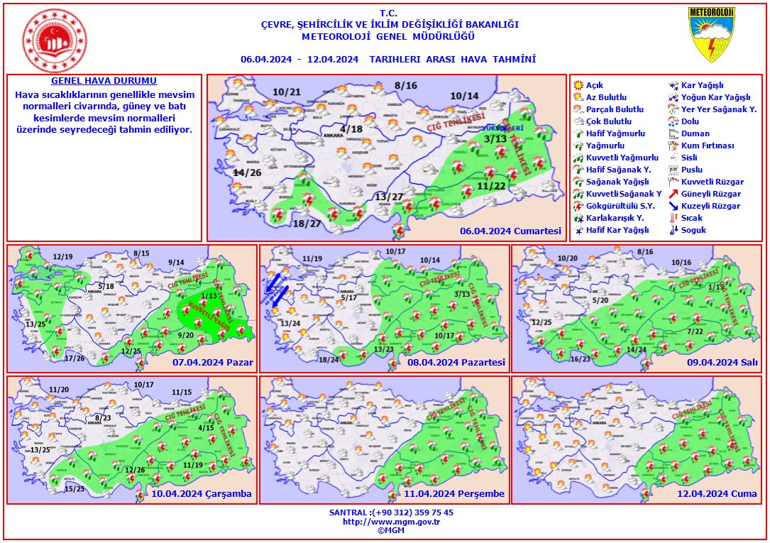 Türkiye geneli için haftalık hava tahminleri şöyle;