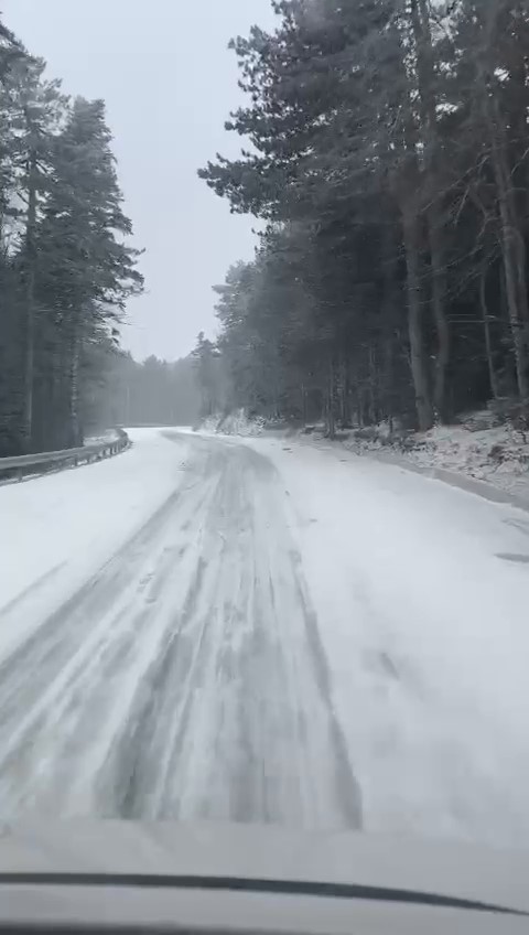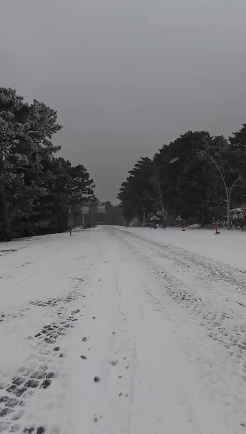 Uludağ’da etkili olan kar yağışıyla birlikte zirveye çıkan yollar karla kaplanmaya başladı.