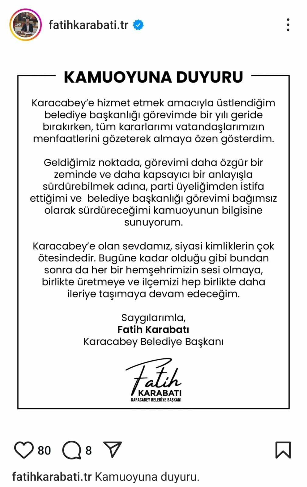 Karabatı, sosyal medya hesabından yayınladığı açıklamada, “Karacabey’e hizmet etmek amacıyla üstlendiğim belediye başkanlığı görevimde bir yılı geride bırakırken, tüm kararlarımı vatandaşlarımızın menfaatlerini gözeterek almaya özen gösterdim. Geldiğimiz noktada görevimi daha özgür bir zeminde ve daha kapsayıcı bir anlayışla sürdürebilmek adına, parti üyeliğimden istifa ettiğimi ve belediye başkanlığı görevimi bağımsız olarak sürdüreceğimi kamuoyunun bilgisine sunuyorum. Karacabey’e olan sevdamız, siyasi kimliklerin çok ötesindedir. Bugüne kadar olduğu gibi bundan sonra da her bir hemşehrimizin sesi olmaya, birlikte üretmeye ve ilçemizi hep birlikte daha ileriye taşımaya devam edeceğim” dedi.