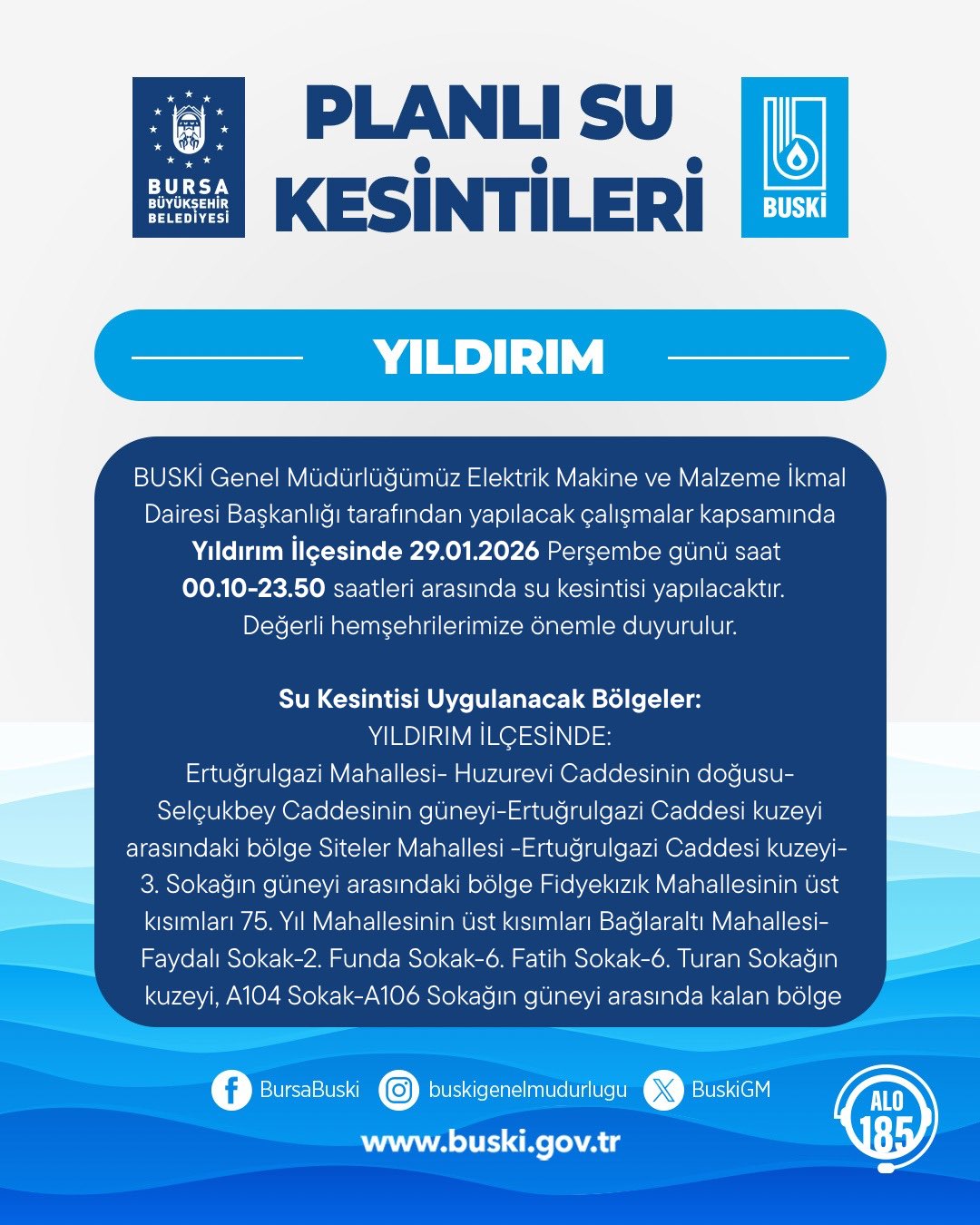 “BUSKİ Genel Müdürlüğümüz Elektrik Makine ve Malzeme İkmal Dairesi Başkanlığı tarafından yapılacak çalışmalar kapsamında Yıldırım İlçesinde 29.01.2026 Perşembe günü saat 00.10-23.50 saatleri arasında su kesintisi yapılacaktır. Değerli hemşehrilerimize önemle duyurulur.
