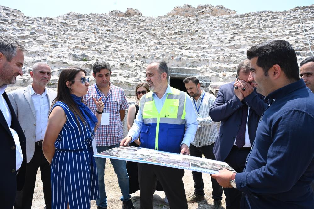 Bursa Büyükşehir Belediye Başkanı Alinur Aktaş, beraberindeki İznik Belediye Başkanı Kağan Mehmet Usta ile birlikte tarihi İznik Roma Tiyatrosu’nda devam eden çalışmaları yerinde inceledi. Uygulamaları tamamlanma aşamasına gelen restorasyon projesi hakkında Kazı Başkanı Doç.Dr. Aygün Ekin Meriç’ten bilgi alan Başkan Aktaş, İznik Müze Müdürlüğü başkanlığında devam eden kazı çalışmalarına Büyükşehir olarak destek verdiklerini hatırlattı. Bursa Kültür Varlıklarını Koruma Bölge Kurulu’nca onaylı proje çerçevesinde çalışmaların sürdüğünü hatırlatan Başkan Aktaş, “İznik Roma Tiyatrosu projesinde temel yaklaşım; mevcut oturma basamakları, sahne bölümü ve diğer yapı kalıntılarının olumsuz müdahale ve eklentilerden arındırılmasına, uygun bir şekilde korunması için dondurma ve derz işlemi yapılmasına yönelik oldu. Uzun yıllardır İznik turizmine kazandırılmaya çalışılan Roma Tiyatrosu’nda, bizim çalışmalarımızla birlikte, yerli ve yabancı turistlerin alanı gezmesine yönelik gezi güzergâhı oluşturuldu. Oturma basamaklarının üst kısmında yer alan seyir platformu oluşturuldu ve alanın net bir şekilde izlenebilmesi sağlandı. Dondurma işlemleri, derz çalışmaları, seyir platformu ve gezi rotasına yönelik çalışmalar devam ediyor. Aralık ayına kadar çalışmaları bitirmeyi hedefliyoruz. Ben inanıyor ve ümit ediyorum ki ziyaret noktasında Türkiye’deki en iddialı amfi tiyatrolardan bir tanesi olacak ve İznik’in asıl çekim merkezi burası olacak. Sadece İznik için değil, sadece ülkemiz için değil, insanlık adına yapılmış bu çok güzel yatırımı bütün dünyayla buluşturmanın heyecanını yaşıyoruz” diye konuştu.