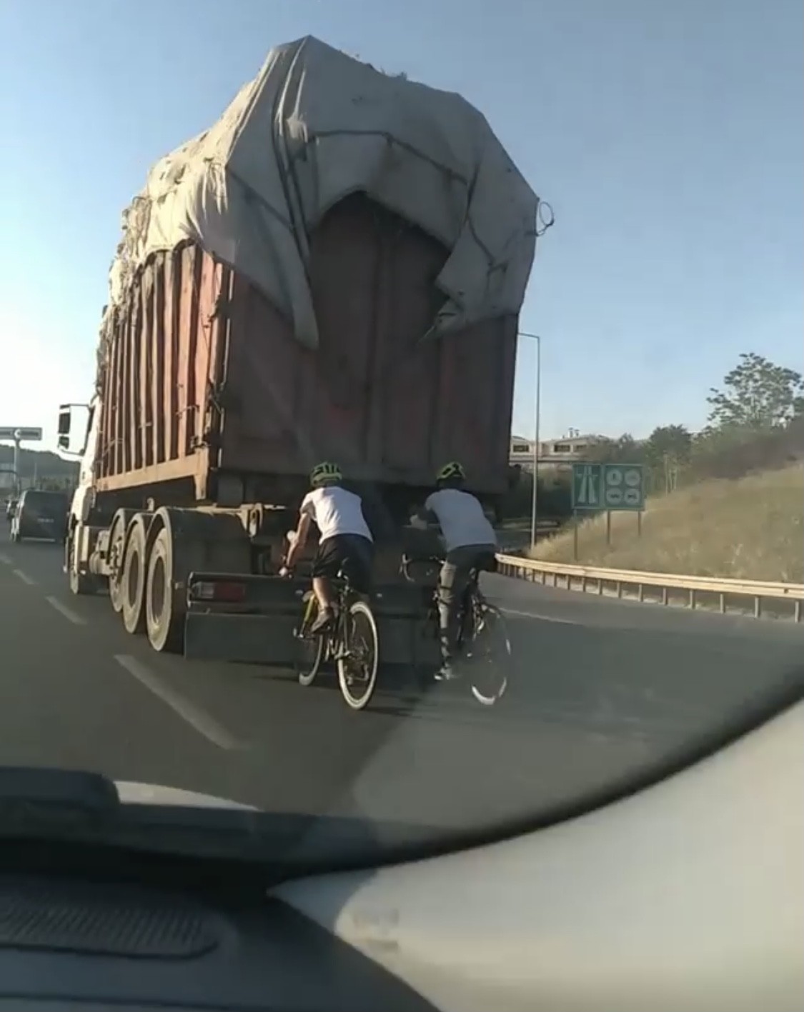 Bisiklet süren genç, TIR’ın arka tarafına tutunarak seyahat etti.
