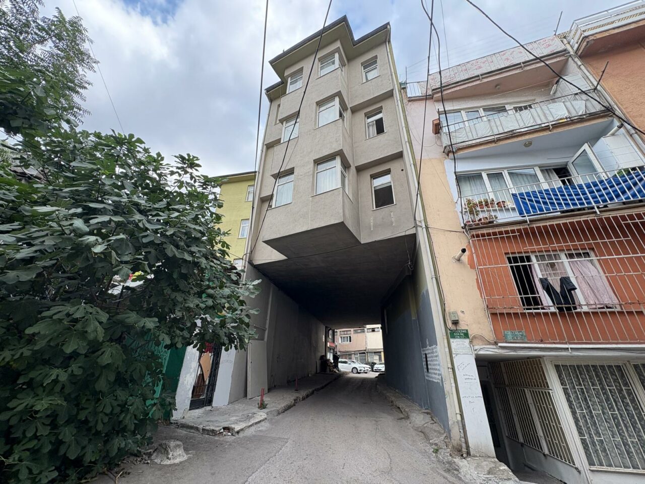 Mahalle sakinleri, binanın altından geçerken endişe duyduklarını dile getirirken, birçok araç da binanın altından geçiyor.