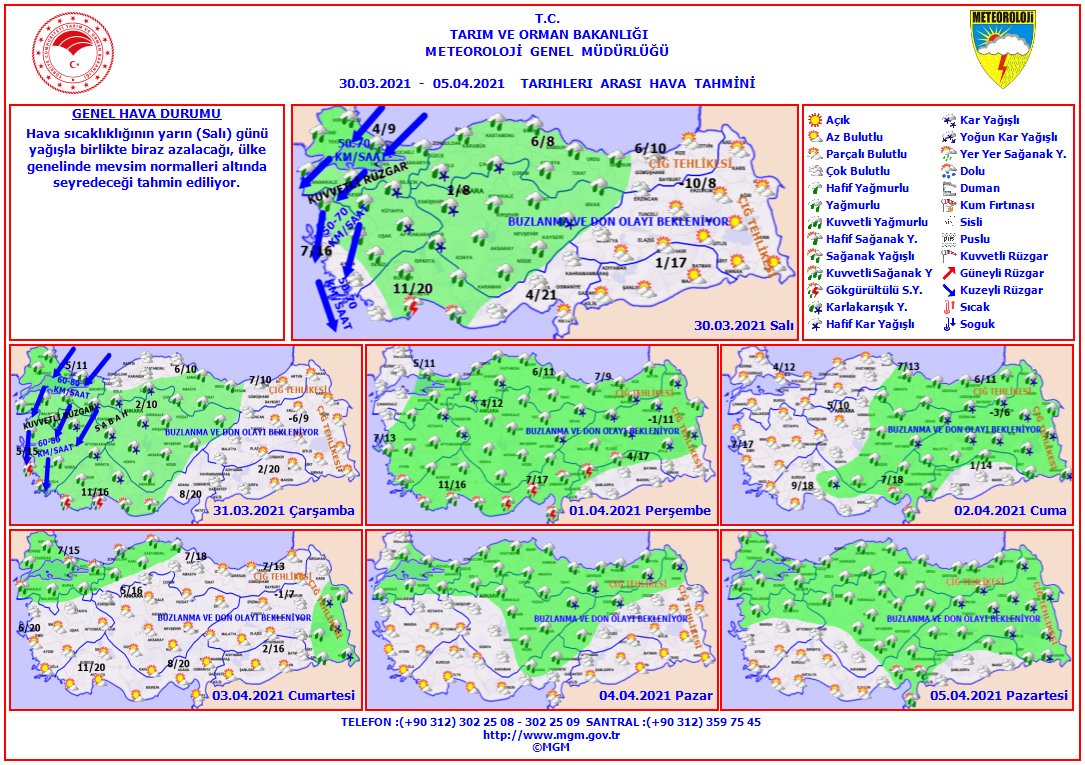 Haftalık Hava Durumu (30 Mart – 5 Nisan 2021) Hava sıcaklığının yarın (Salı) günü yağışla birlikte biraz azalacağı, ülke genelinde mevsim normalleri altında seyredeceği tahmin ediliyor.