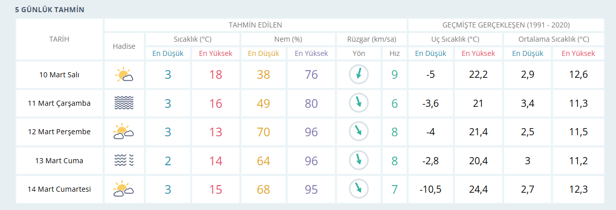 Meteoroloji Genel Müdürlüğü’nün Bursa için yayımladığı 5 günlük hava tahmin raporu: