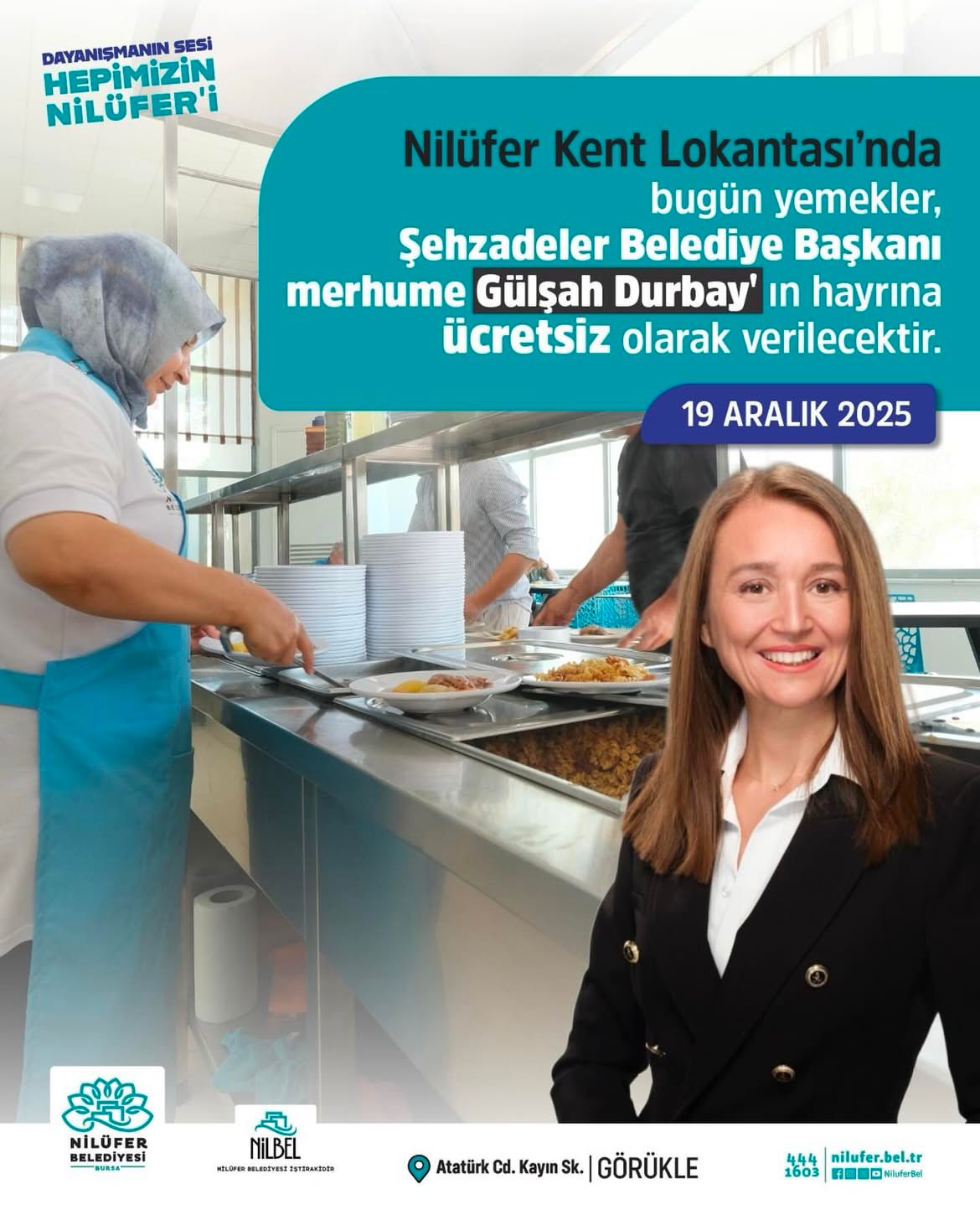 Görükle’deki Nilüfer Kent Lokantası’nda bugünkü yemekler Şehzadeler Belediye Başkanı merhuma Gülşah Durbay’ın hayrına ücretsiz olarak verilecek.