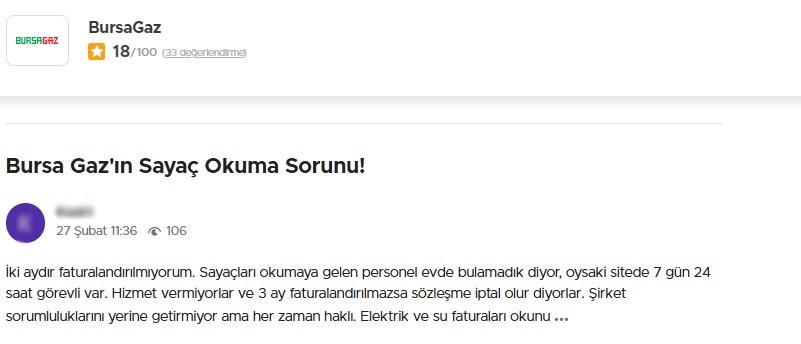 “İki aydır faturalandırılmıyorum. Sayaçları okumaya gelen personel evde bulamadık diyor, oysa ki sitede 7 gün 24 saat görevli var. Hizmet vermiyorlar ve 3 ay faturalandırılmazsa sözleşme iptal olur diyorlar. Şirket sorumluluklarını yerine getirmiyor ama her zaman haklı. Elektrik ve su faturaları okunuyor ama çok gariptir ki Bursa Gaz okuyamıyor. Herkes işini yapsın.”