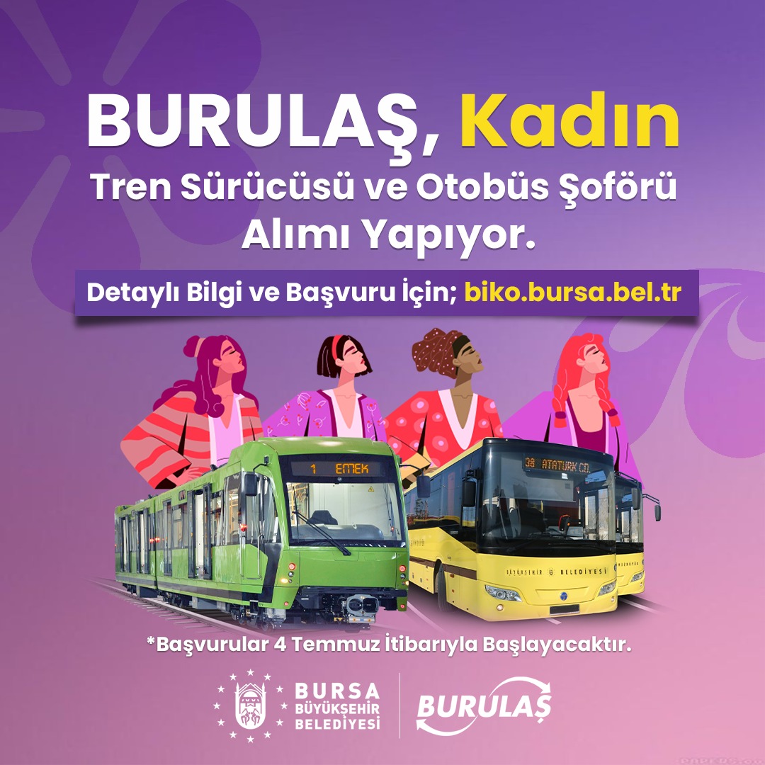 BURULAŞ bünyemize kadın tren sürücüsü ve otobüs şoförü alımı yapıyoruz. Başvurularınızı 4 temmuz itibarıyla biko.bursa.bel.tr adresinden yapabilirsiniz.