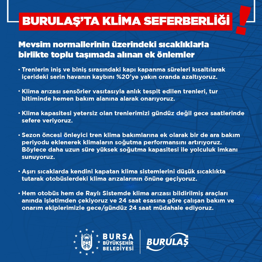 “Toplu taşıma için 20 kişilik ek klima denetim ekibimizi devreye alıyoruz! Otobüslerimiz ve trenlerimizde günlük denetimler yaparak, klima sorunlarını tespit edip çözüme kavuşturuyoruz. Denetim ekiplerimiz haftanın 7 günü sahada, günlük kontrolleri gerçekleştiriyor.”