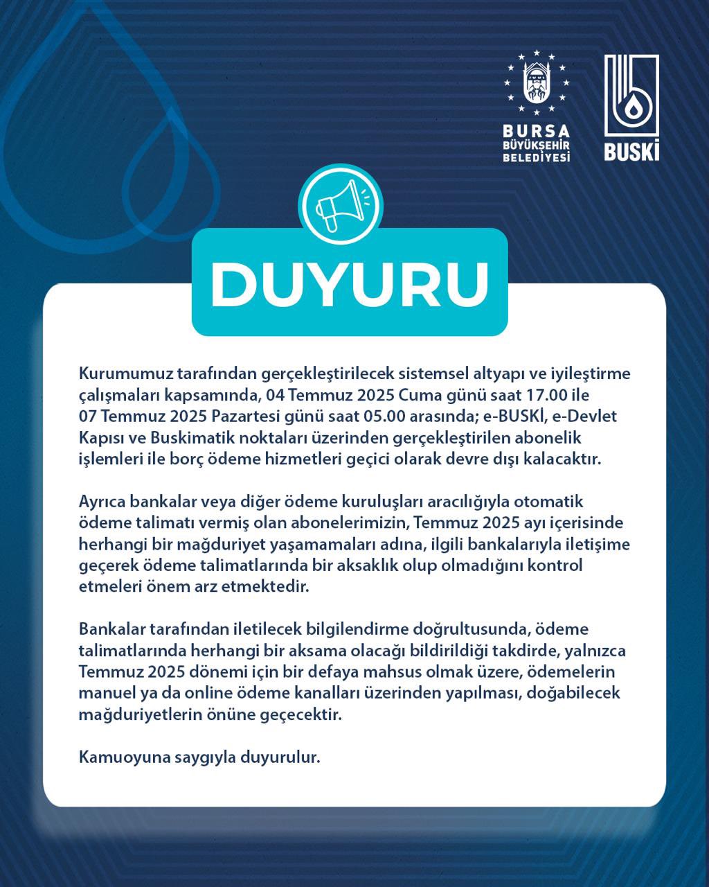 Ana Sayfa › Bursa › Bursa’da BUSKİ’den önemli duyuruBursa’da BUSKİ’den önemli duyuru BUSKİ, 4 Temmuz Cuma ile 7 Temmuz Pazartesi günleri arasında devre dışı kalacak uygulamalarla ilgili bilgilendirme yaptı… Giriş: 03-07-2025 21:59Kaynak: HABER MERKEZİ Bursa ABONE OL + - BUSKİ’nin duyurusu şöyle; HABERİ PAYLAŞ