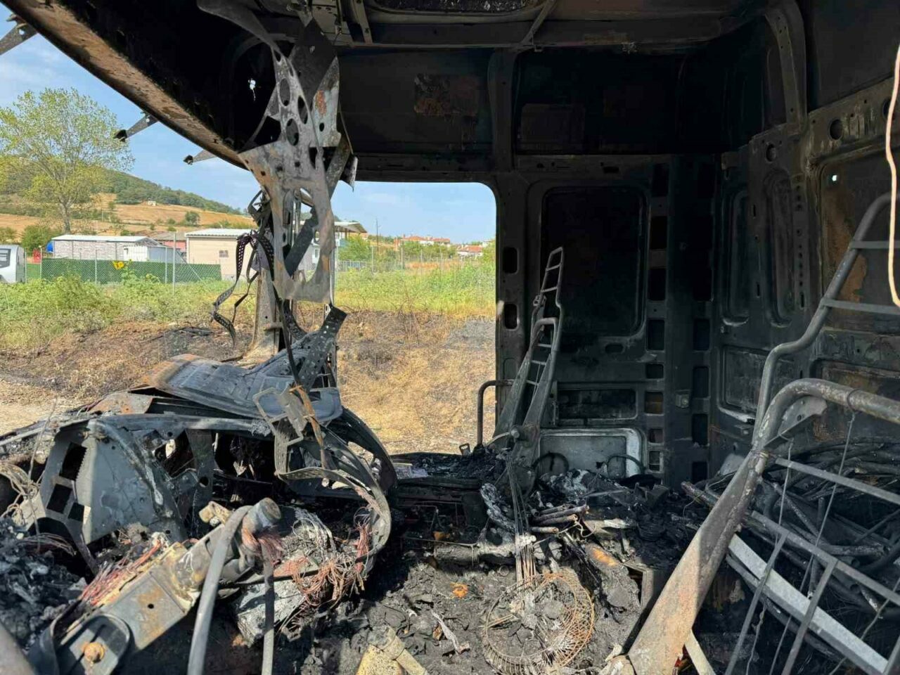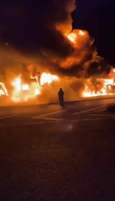 Alevlerin arasında kalan 2 itfaiye erinin yanmaktan son anda kurtulduğu anlar kameralara yansıdı. Tır ve üzerindeki onlarca çamaşır makinesi tamamen yanarak kullanılmaz hale geldi.