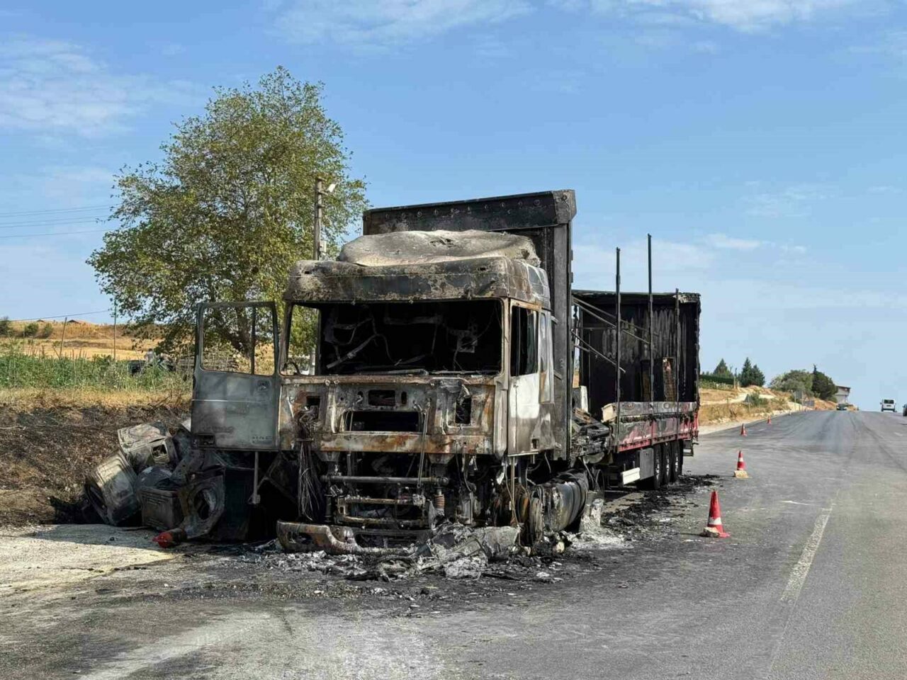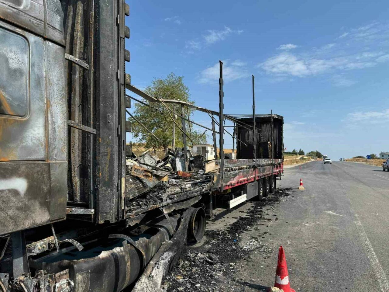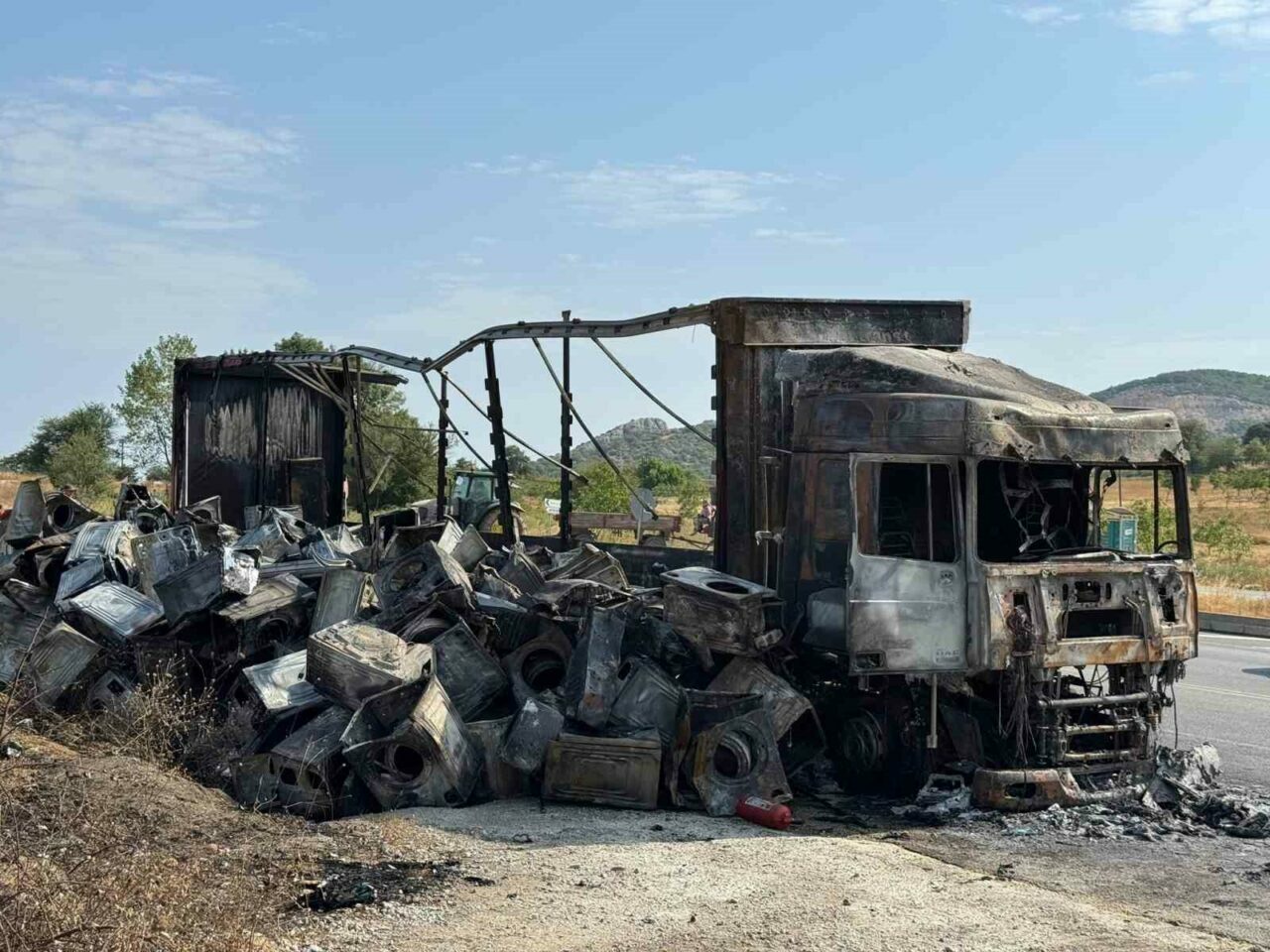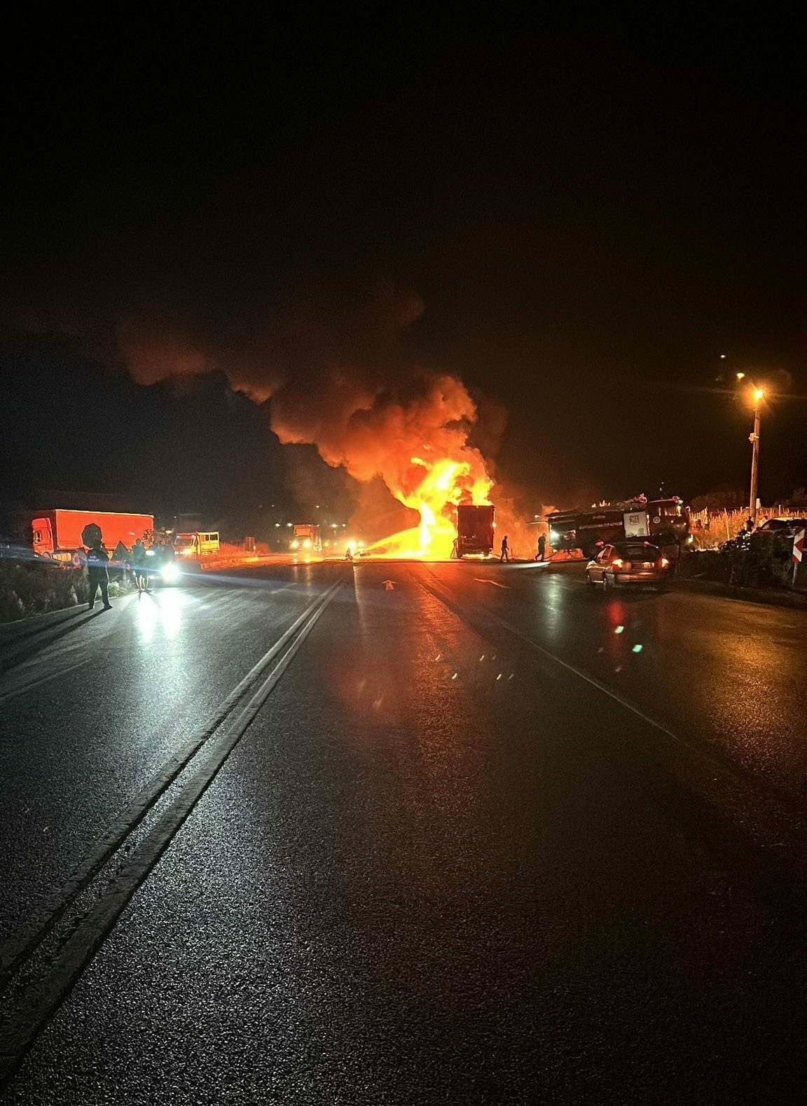 Üzerinde çamaşır makinesi yüklü olduğu öğrenilen Murat Yamanarda (51) idaresindeki 55 AIY 740 tır, seyir halindeyken bir anda yanmaya başladı.