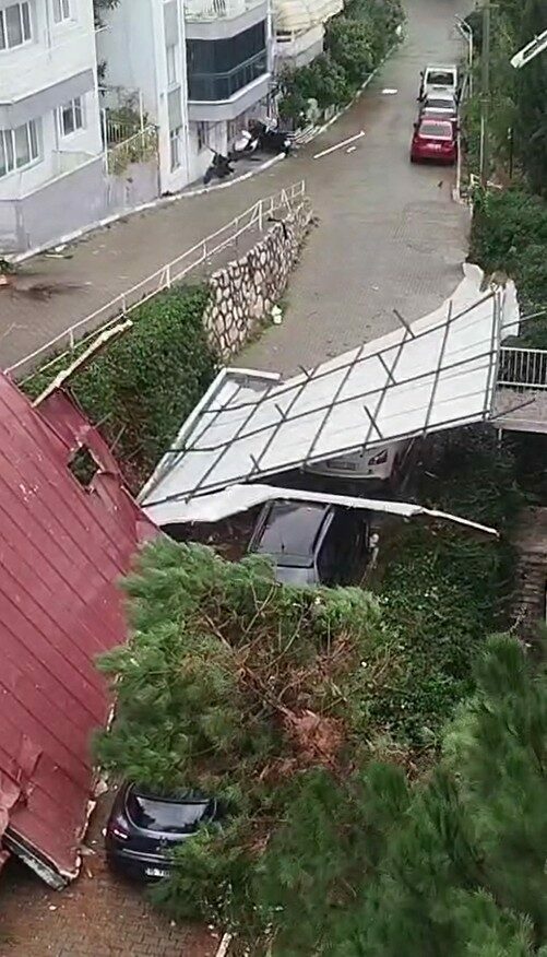 Fırtına nedeniyle binaların çatıları uçtu, park halindeki bazı araçlar ise zarar gördü.