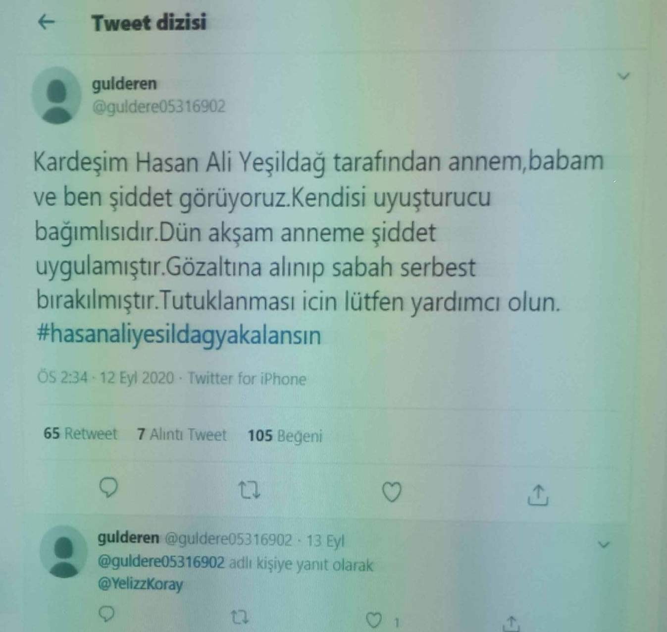Gülderen Yeşildağ’ın sosyal medyadaki paylaşımlarında, “Kardeşim Hasan Ali Yeşildağ tarafından annem, babam ve ben şiddet görüyoruz. Kendisi uyuşturucu bağımlısıdır. Dün akşam anneme şiddet uygulamıştır. Gözaltına alınıp sabah serbest bırakılmıştır. Tutuklanması için lütfen yardımcı olun. Beni ölümle tehdit ediyor. Şiddet görüyorum, sesimi duyun. Bana tecavüz edip sonra öldüreceğini söylüyor. Can güvenliğim bulunmuyor” dediği öğrenildi.