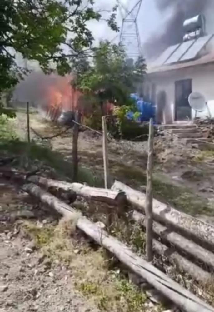 Evlerin alev topuna döndüğü yangında bahçede park halinde bulunan bir traktör de yanarak kullanılmaz hale geldi.