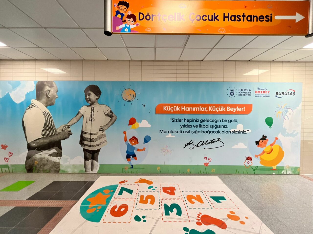 Özellikle Dörtçelik Çocuk Hastanesi’ne gidiş ve dönüşlerde çocukların moralini yüksek tutmak ve onları neşelendirmek için Bursa Büyükşehir Belediyesi ve iştiraki BURULAŞ tarafından tasarlanan projede istasyonun merdivenlerinden başlayan resimlerle, yer zeminine çizilen oyun alanları çocukları karşılıyor.