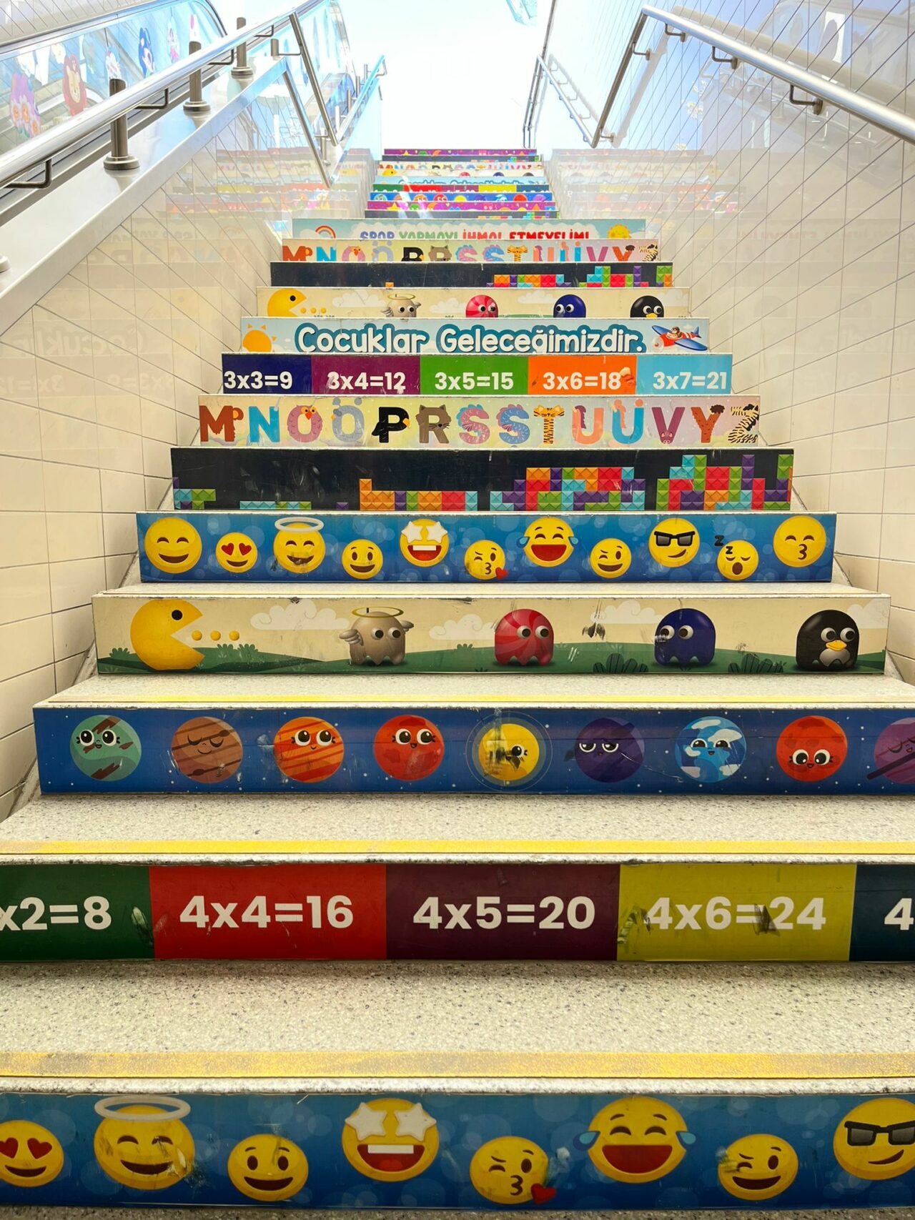 Kalıcı oyuncaklar ve duvar süsleri ile birlikte basamaklarda öğretici bilgiler de bulunuyor.