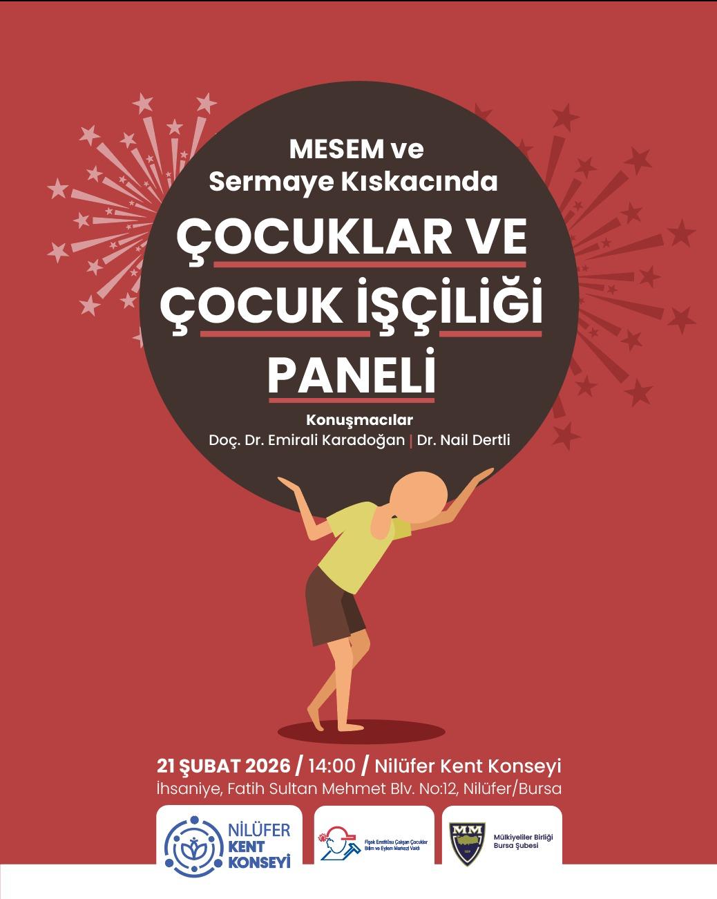 Nilüfer Kent Konseyi, Fişek Enstitüsü Çalışan Çocuklar Bilim ve Eylem Merkezi Vakfı ile Mülkiyeliler Birliği Bursa Şubesi’nin birlikte organize ettiği “Mesem ve Sermaye Kıskacında Çocuklar ve Çocuk İşçiliği” paneli 21 Şubat Cumartesi günü saat 14.00’te gerçekleştirilecek…