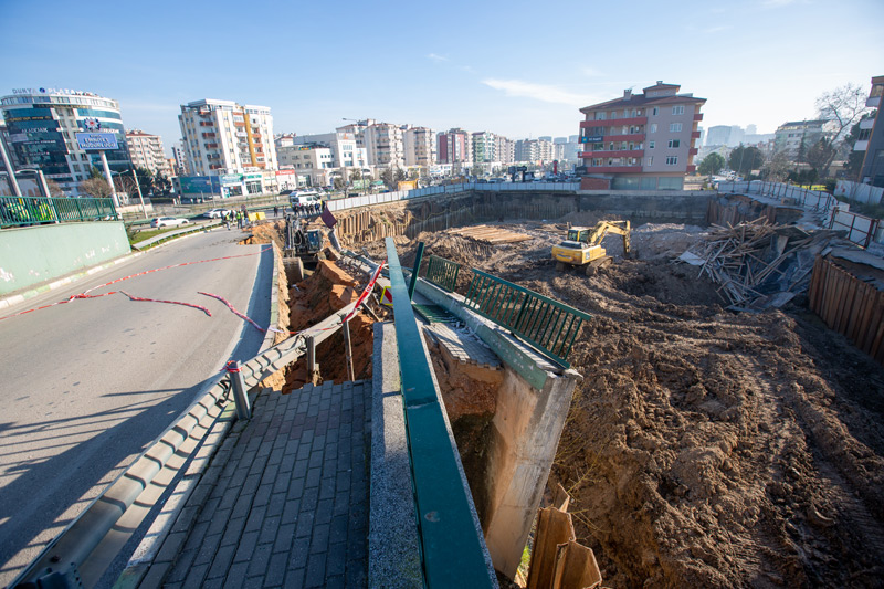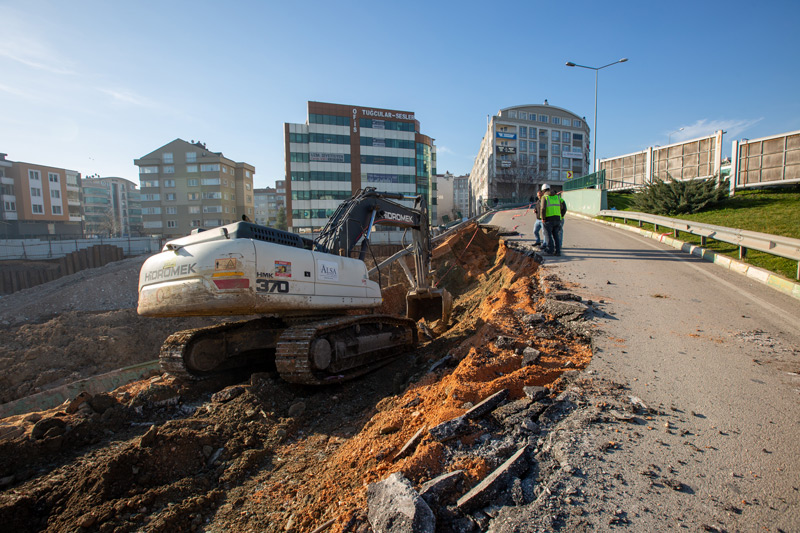 Kavşak kolunun hemen bitişindeki inşaat alanındaki temel kazasının yol açtığı çökmenin ardından Bursa Büyükşehir Belediyesi ekipleri, hemen yolu trafiğe kapattı.