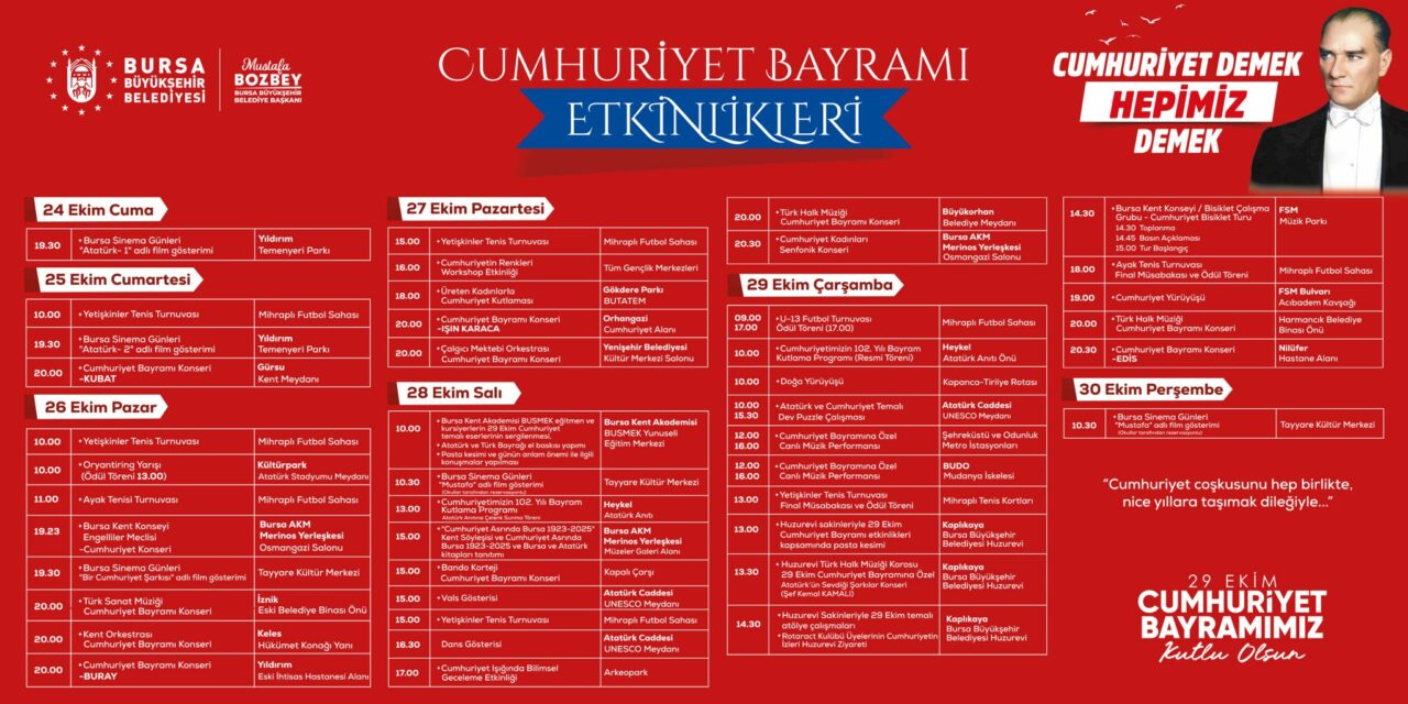 Büyükşehir Belediyesi’nin sosyal medya hesabından yapılan paylaşımda, Cumhuriyet Bayramı kutlamalarının bir gelenek haline gelen Cumhuriyet yürüyüşü ile başlayacağı belirtildi. Etkinliklerde Kubat, Buray, Işın Karaca ve Edis gibi ünlü sanatçılar da sahne alarak Bursalılara unutulmaz anlar yaşatacak.