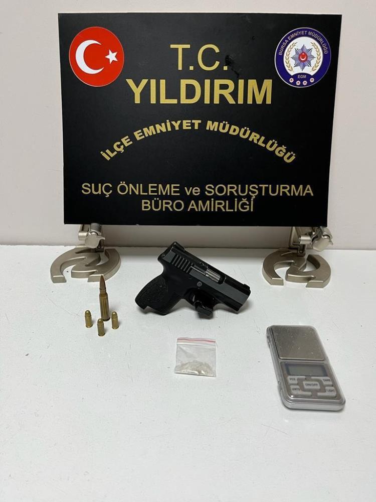 Yıldırım ilçesi Anadolu Mahallesi Güneş Sokak üzerinde bulunan ve daha önce tespit ettikleri şüpheli (29) A.G.’nin evine baskın yapan Yıldırım Araştırma Büro Amirliği ekipleri şüpheliyi gözaltına aldı.