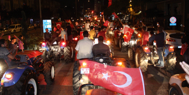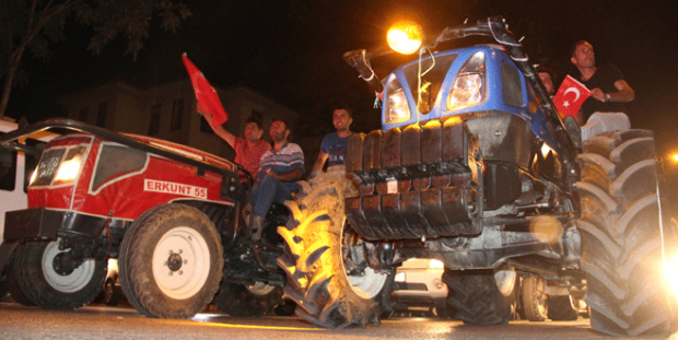 Bursa’nın farklı köylerinden vatan nöbetine traktörleriyle gelen çiftçiler ise “Çiftçiler burada, darbeciler nerede?” sloganları attılar. Onlarca traktörden oluşan konvoy ilginç görüntülere sahne olurken vatandaşlar bu anları fotoğraflamayı da ihmal etmedi.