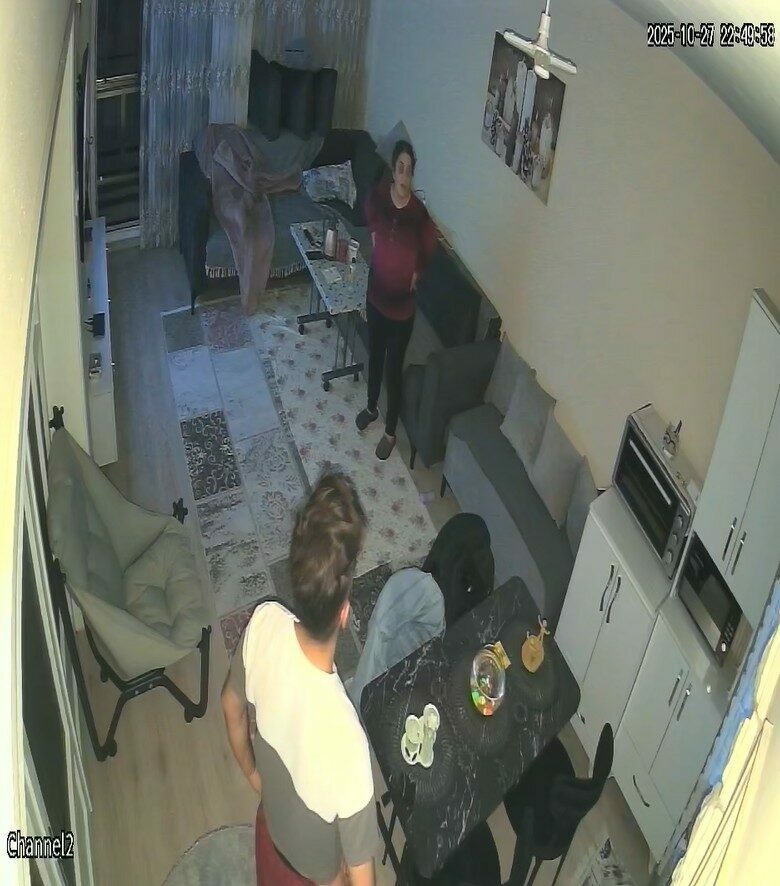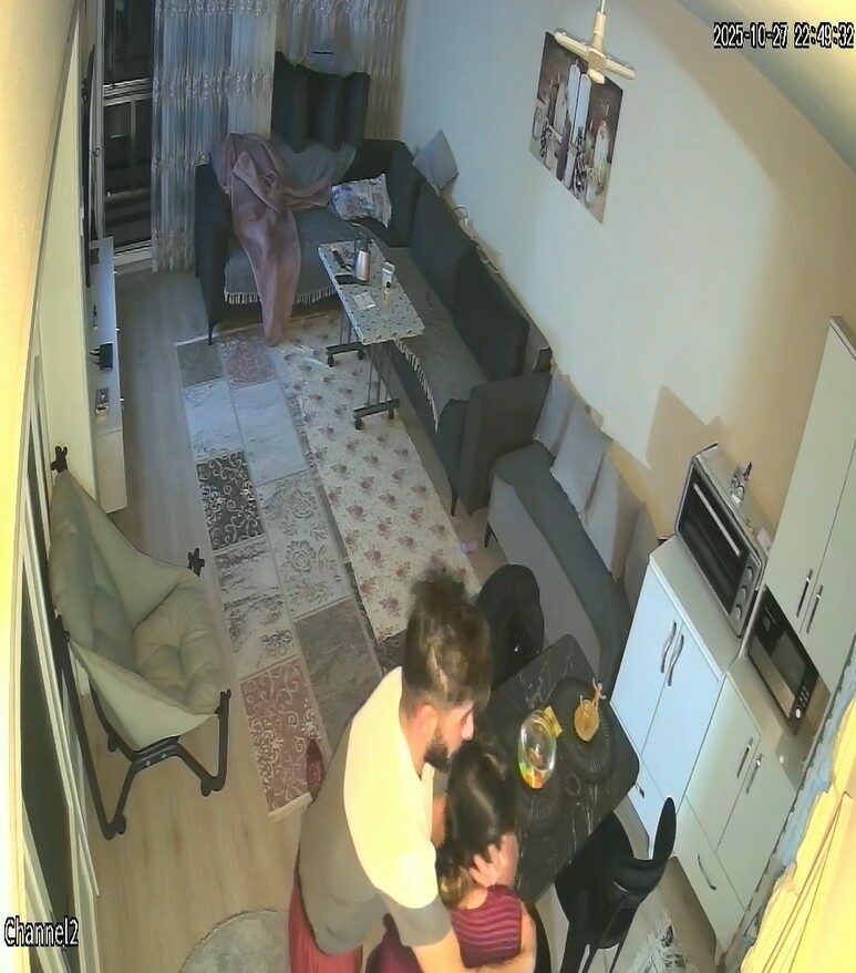 Anne-oğul birbirlerine sarılarak sarsıntının geçmesini beklerken, o anlar evdeki güvenlik kamerasına yansıdı.