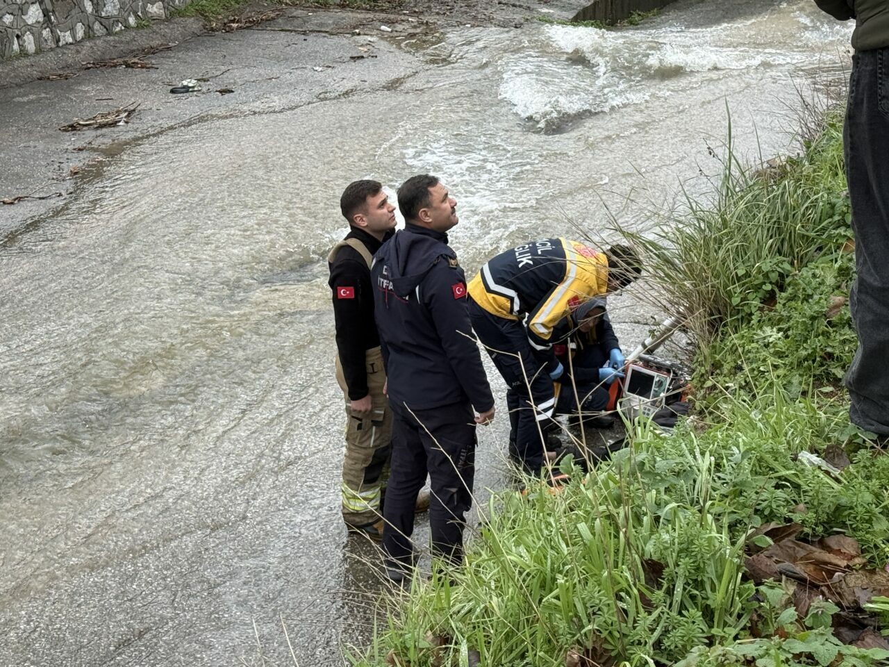 İtfaiye merdiveniyle dere yatağına giren ekipler, bu kişinin hayatını kaybettiğini belirledi.